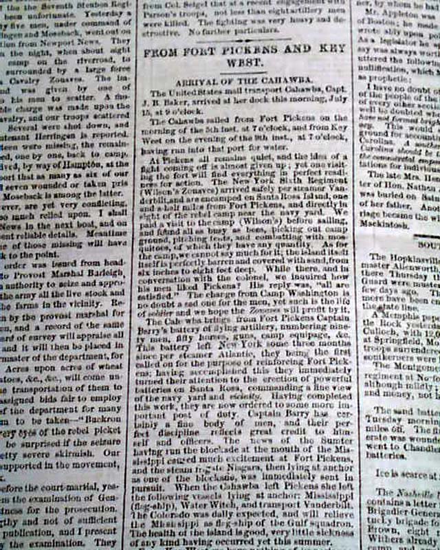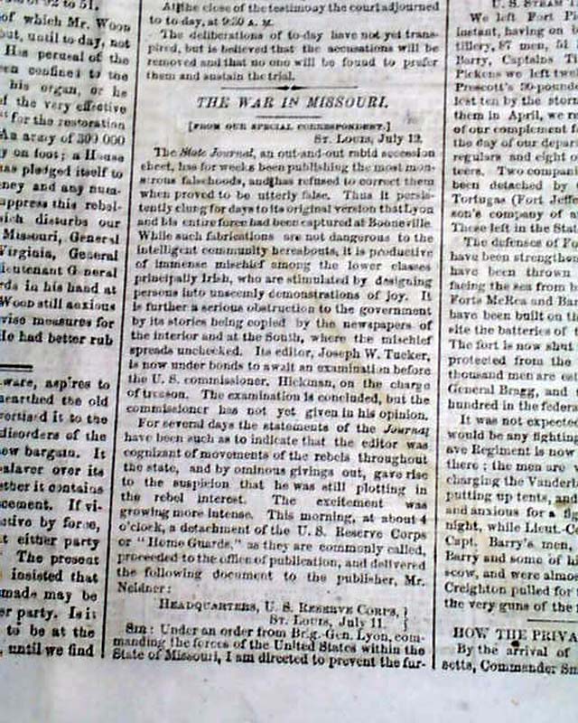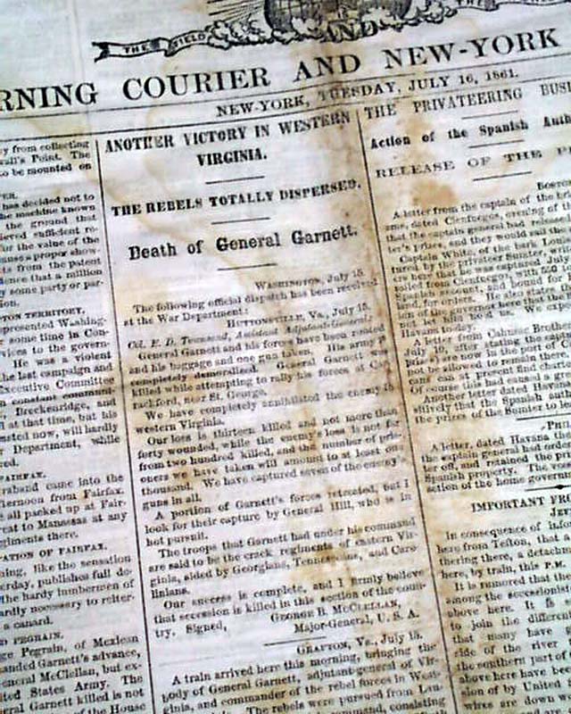 Nice front page column heads on the Civil War include: "The Southern Rebellion" "Triumphant Advance of Gen. McClellan" "The Rebellion Killed in Western Virginia" "Ten Regiments Cross the Potomac" "A Skirmish at Great Falls" "Another Victory in Western Virginia" "The Rebels Totally Dispersed" and more.