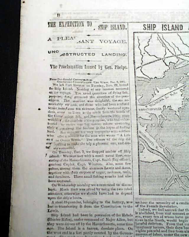 The back page features a Civil War map headed: "SHIP ISLAND AND ITS SURROUNDINGS". Column heads include: "THE EXPEDITION TO SHIP ISLAND" "Unobstructed Landing" "Slavery in the District of Columbia" "Interesting From Port Royal" "The Expedition To Beaufort" "A Negro Battle" and much more.