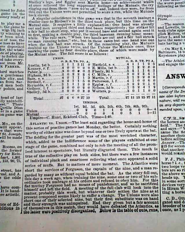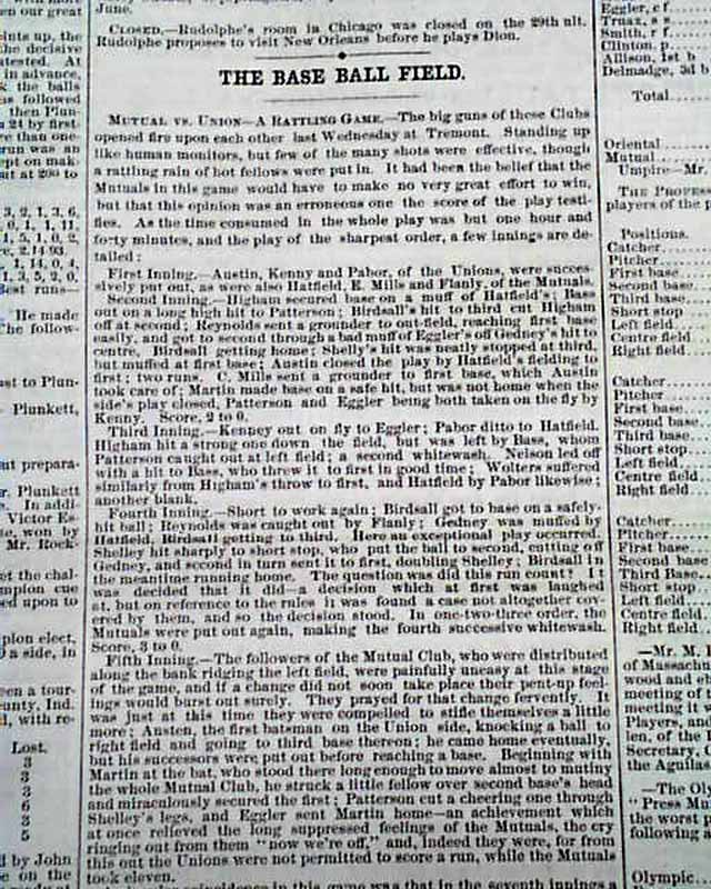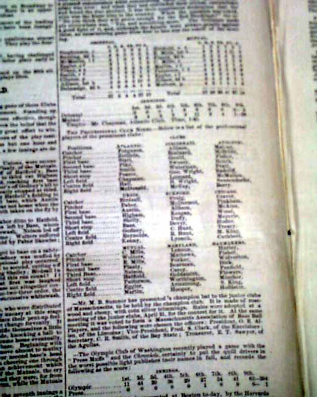 Close to half of page 4 is taken up with: "The Base Ball Field" which includes text and box scores for 3 games, but also includes a list of: "The Professional Club Nines....a list of the professional players of the prominent clubs:" Also other baseball-related articles beyond the games.