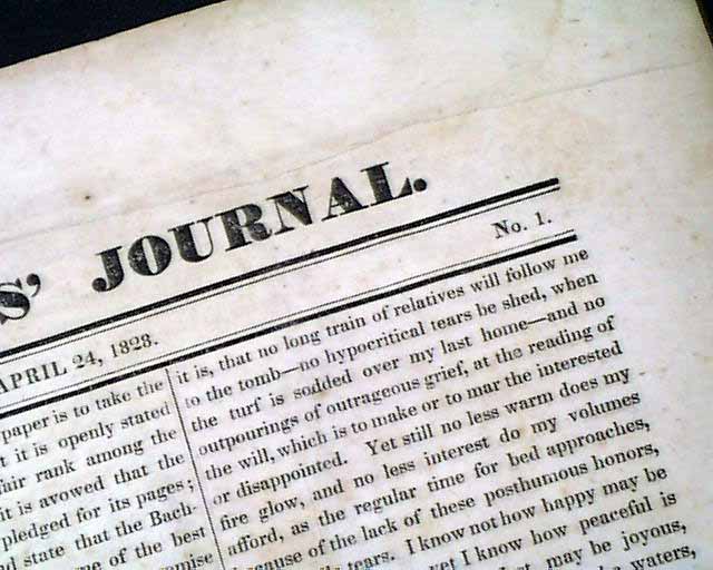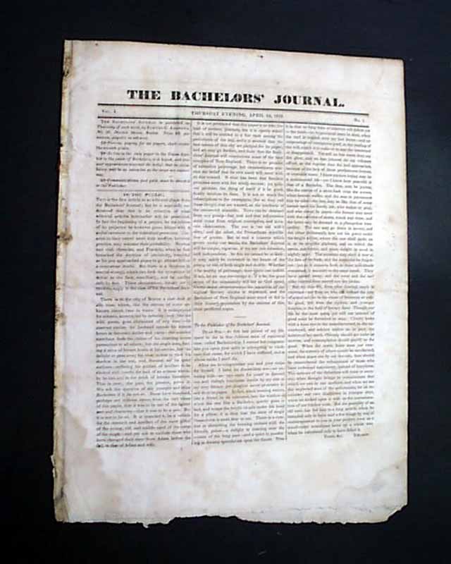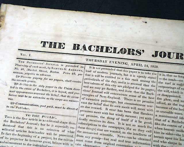 THE BACHELORS' JOURNAL, Boston, April 24, 1828 This is the first issue--volume 1, number 1--of a quite scarce title that existed for just 22 issues, through Sept. 18, 1828. This title is not listed in Gregory's "Union List of Newspapers".