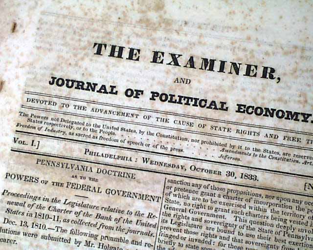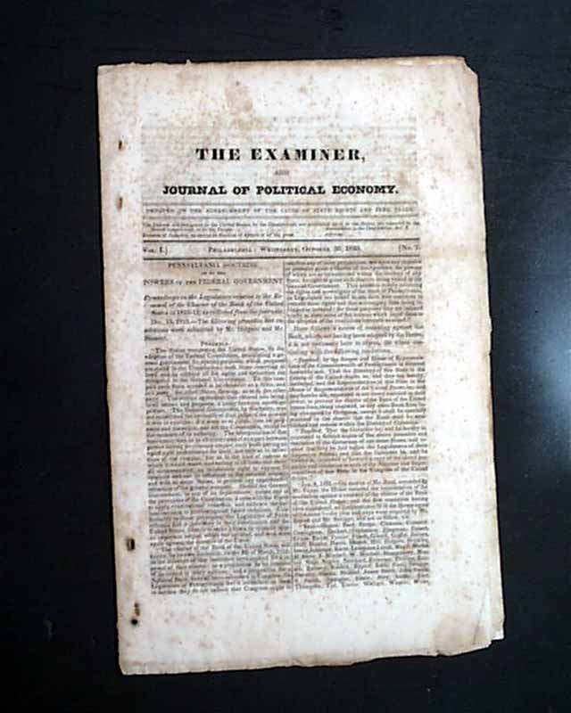 THE EXAMINER & JOURNAL OF POLITICAL ECONOMY, Philadelphia, Oct. 30, 1833 The masthead includes: "Devoted to the Advancement of the Cause of State Rights and Free Trade." This is the volume 1, number 7 issue. This title existed for less than two years. We believe this is just the 2nd issue of this title we have offered in our 50+ years.