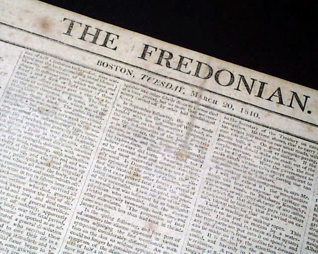 AI notes: The Fredonian was a short-lived weekly newspaper published in Boston, Massachusetts in 1810, with its first issue appearing on February 20, 1810 and its final known issue on May 15, 1810; it was printed for the editors by Eleazer G. House, though the names of the editors themselves are not given in surviving records, and the paper existed among a bustling early-19th-century Boston press scene alongside titles like the Columbian Centinel and Independent Chronicle.