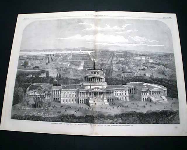Page 3 has: "The Civil War In America" with nearly a column of reporting. This print of the Capitol shows it with the new dome under construction, a somewhat rare print from the era. There is a related article inside.