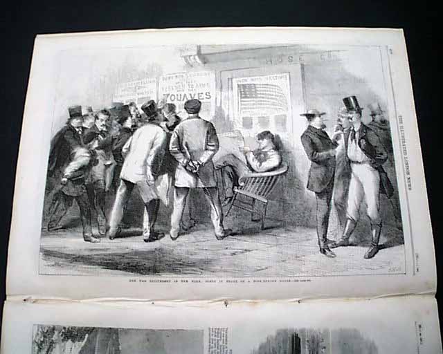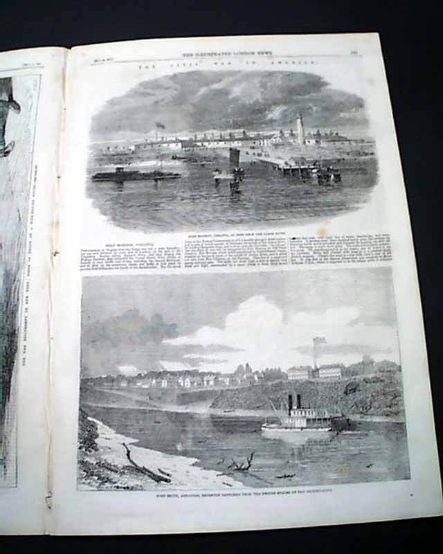Also within is an article: "The American Revolution - The Border Slave States" and then a full page print: "The War Excitement in New York: Scene in Front of a Fire Engine House". Also two nearly half page prints of: "The Civil War In America - Fort Monroe, Virginia, as Seen from the James River" and: "Fort Smith, Arkansas, Recently Captured from the U.S. by the Secessionists", with related articles.