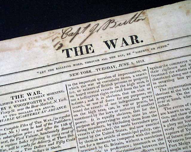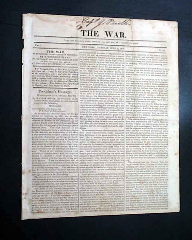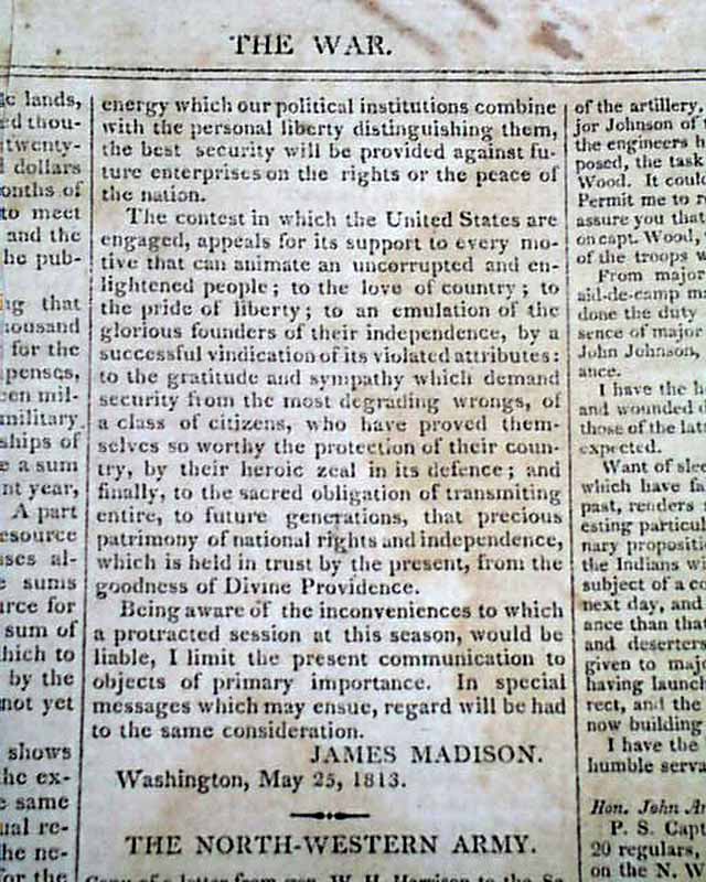 THE WAR, New York, June 1, 1813 The entire front page and half of page 2 are taken up with the: "President's Message" which is signed in type: James Madison. The President announces the United States' acceptance of an offer by the Emperor Alexander of Russia to mediate a resolution to the conflict with Britain and his hopes that this negotiation will end the war quickly. Madison also summarizes the successes of the new Army and Navy, while requesting a tax increase from Congress to finance the conflict.