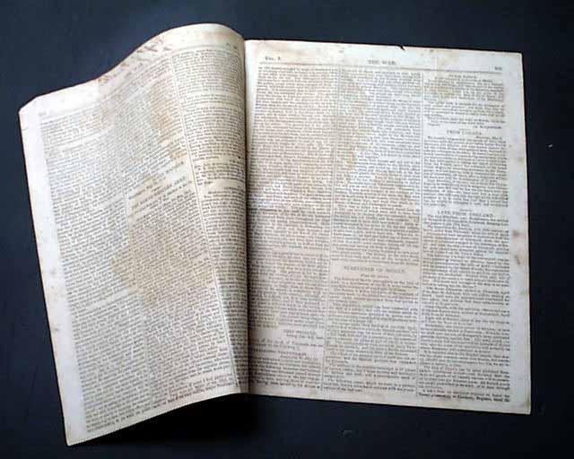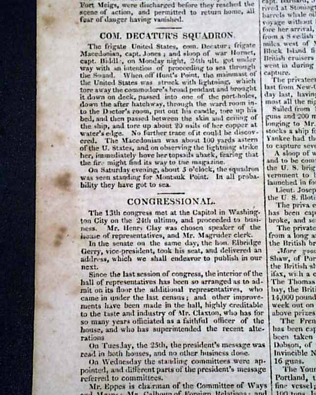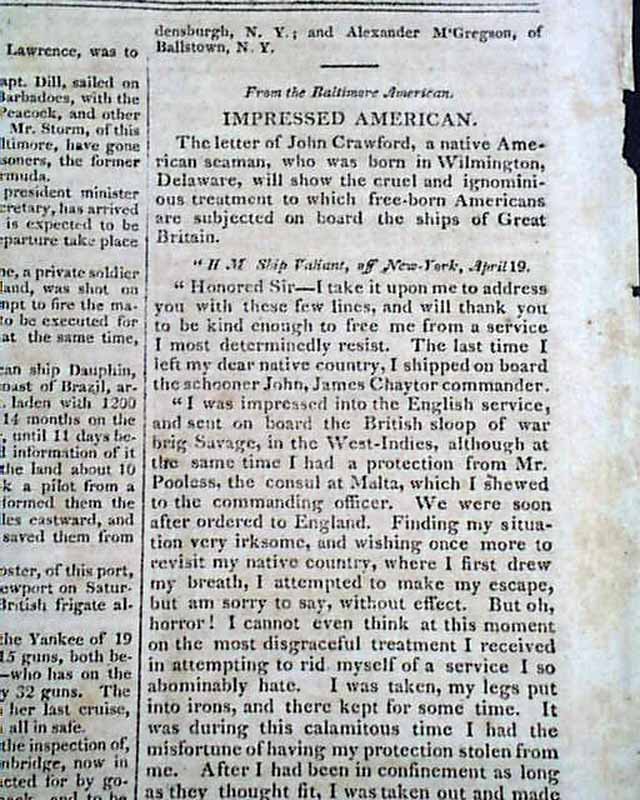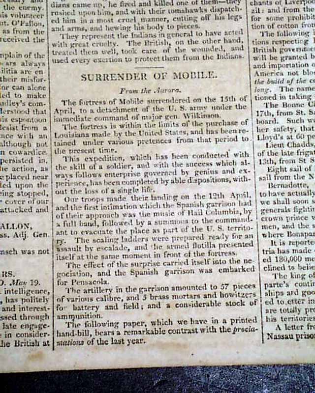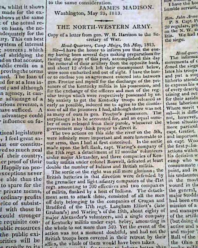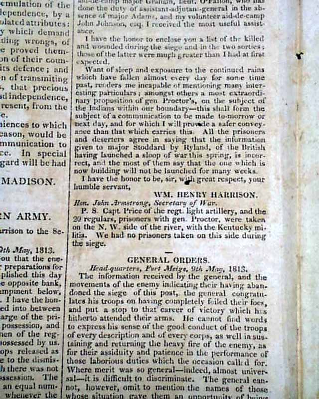 Other articles within: "The North-Western Army" which is a fine letter on the siege of Fort Meigs, signed in type: Wm. Henry Harrison. Also: "General Orders which takes over one-third of a page & is signed: John O'Fallon; "Interesting Particulars" "Surrender of Mobile" "From Canada" "Com. Decatur's Squadron" "Impressed American" and more.