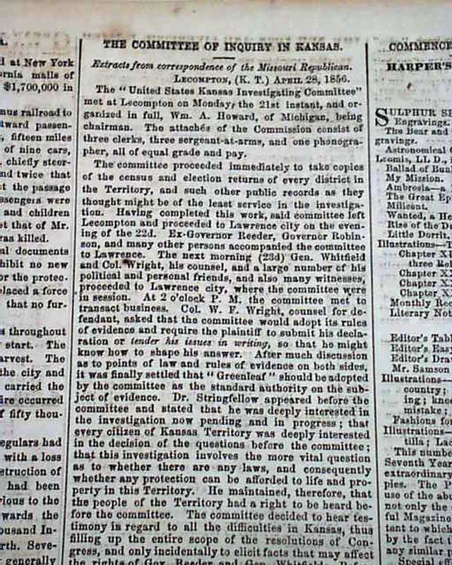 DAILY NATIONAL INTELLIGENCER, Washington, D.C., May 17, 1856 Page 3 has a report headed: "The Committee of Inquiry In Kansas" which takes over half a column to detail the latest in that troubled territory, with much on events around Lawrence.