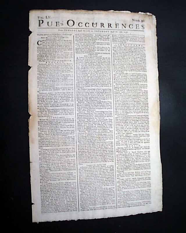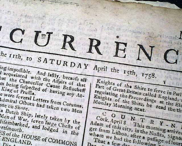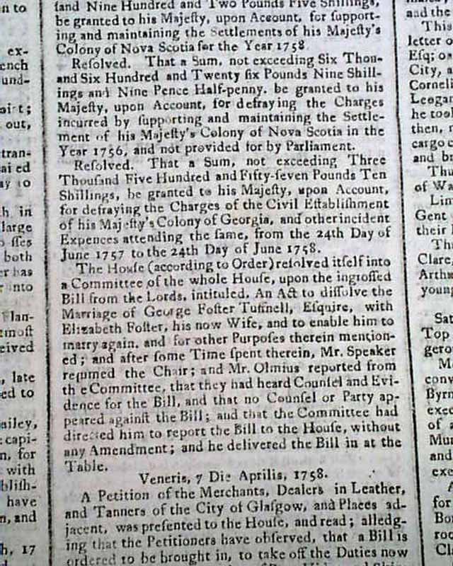 PUE'S OCCURRENCES, Dublin, Ireland, April 15, 1758 An early Irish newspaper with various news reports from throughout Europe with some ads & notices as well. The front page has a brief item from the House of Commons noting: "...Resolved, that a sum...for defraying the charges incurred by supporting and maintaining the settlement of his Majesty's Colony of Nova Scotia...Resolved, that a sum...for defraying the charges of the Civil Establishment of his Majesty's Colony of Georgia...".