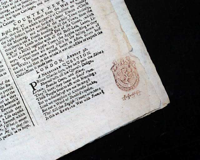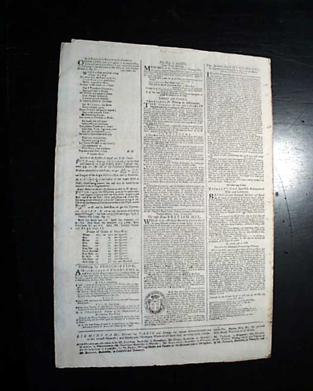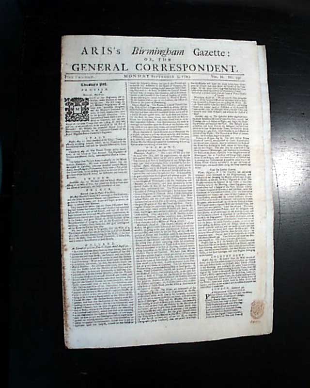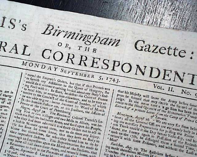 ARIS'S BIRMINGHAM GAZETTE: OR THE GENERAL CORRESPONDENT, England, Sept. 5, 1743 It is quite uncommon to find non-London newspapers from the U.K. from such an early date. The various news reports are almost entirely from Europe, plus various advertisements as well.