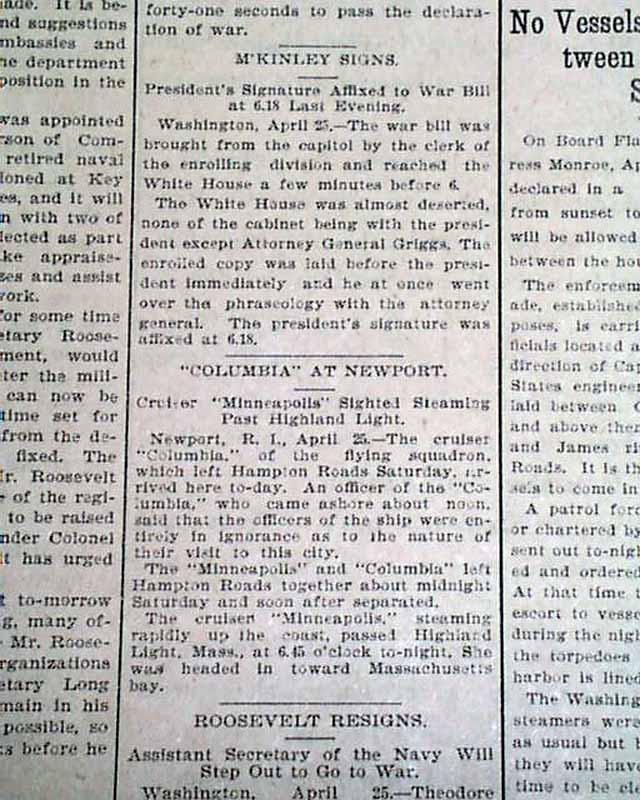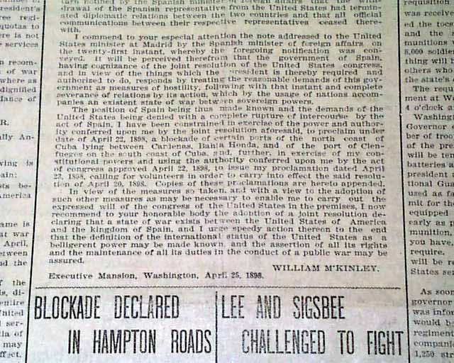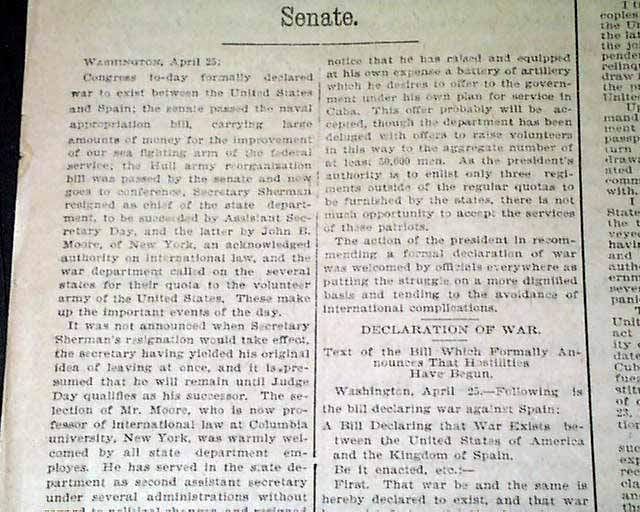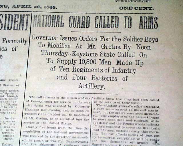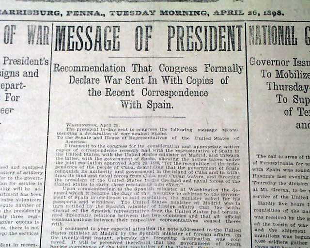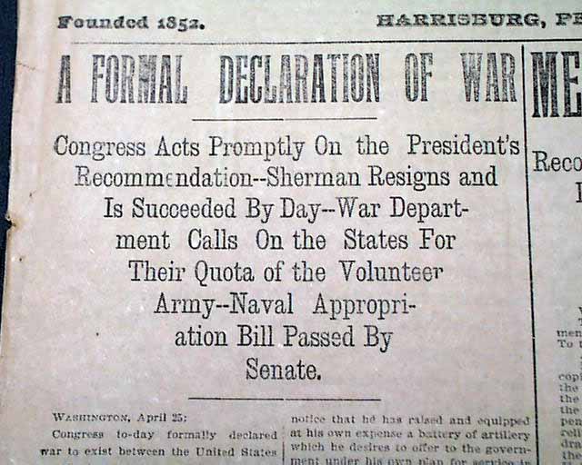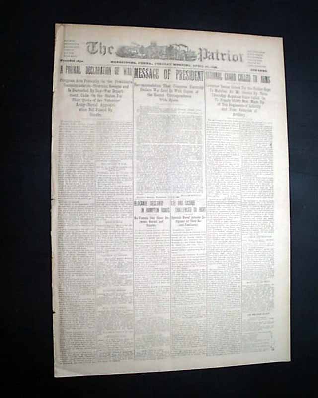 THE PATRIOT, Harrisburg, Pennsylvania, April 26, 1898  A nice issue on the United States entering into war with Spain. The front page has: "A FORMAL DECLARATION OF WAR" "Congress Acts Promptly On the President's Recommendation--Sherman Resigns...War Department Calls On the States For Their Quota of the Volunteer Army...".