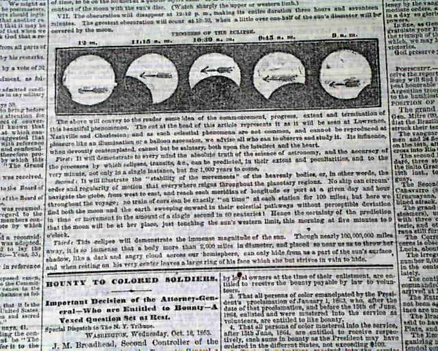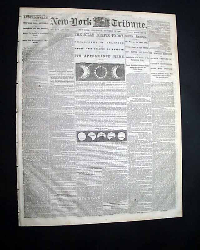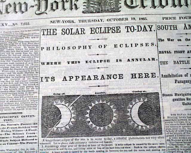 NEW YORK TRIBUNE, Oct. 19, 1865  A doubly interesting issue as the front page has a graphic account of: "THE SOLAR ECLIPSE TO-DAY" "Philosophy of Eclipses" "Where This Eclipse is Annular" "Its Appearance Here" with two graphics.