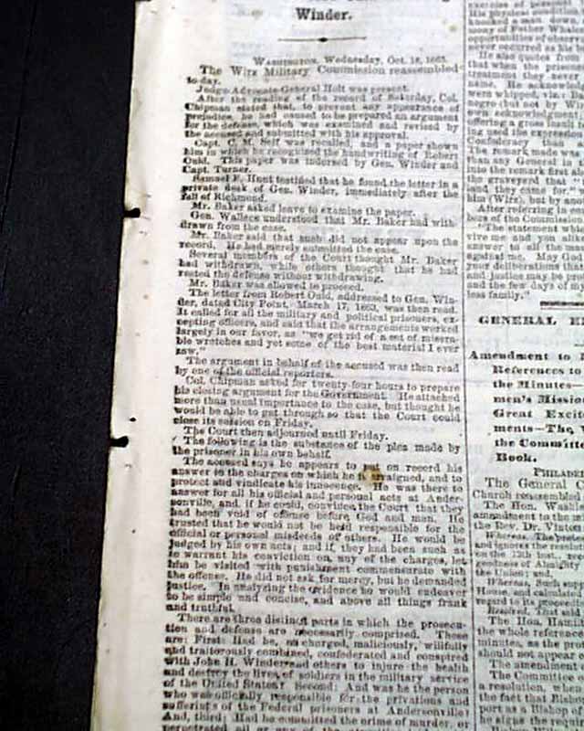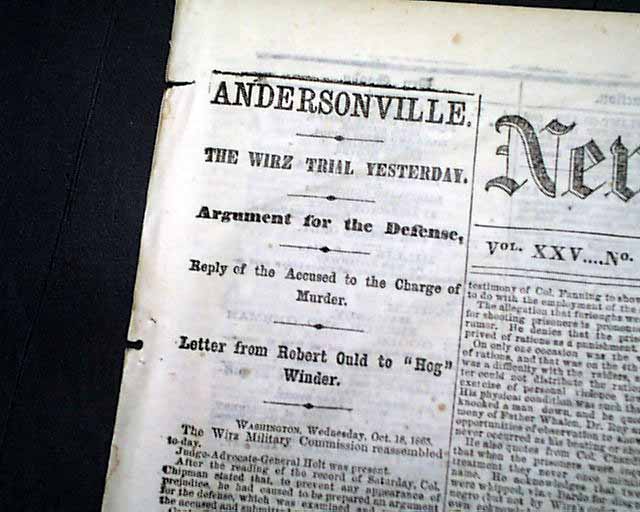 Also on the front page: "ANDERSONVILLE" "The Wirz Trial Yesterday" "Reply of the Accused to the Charge of Murder".