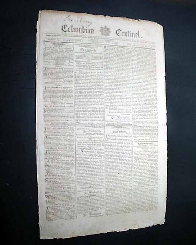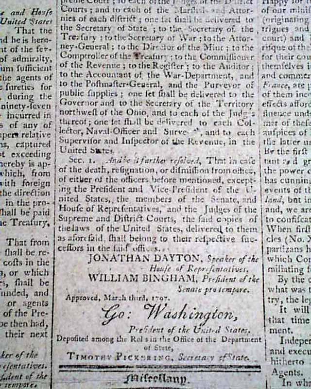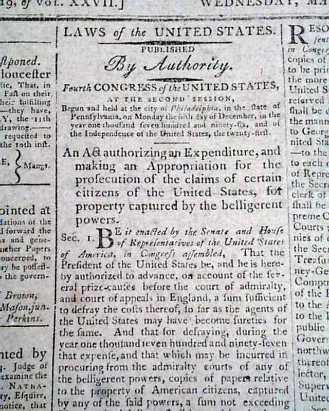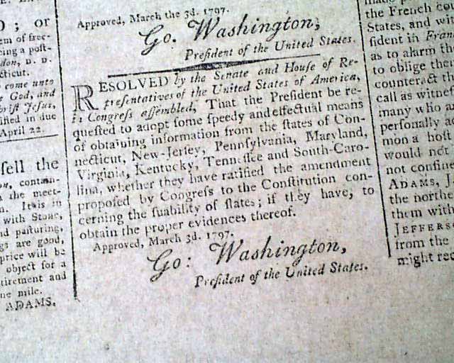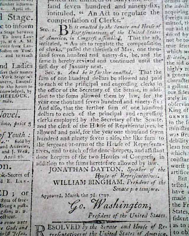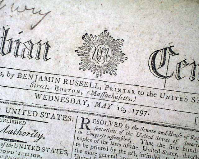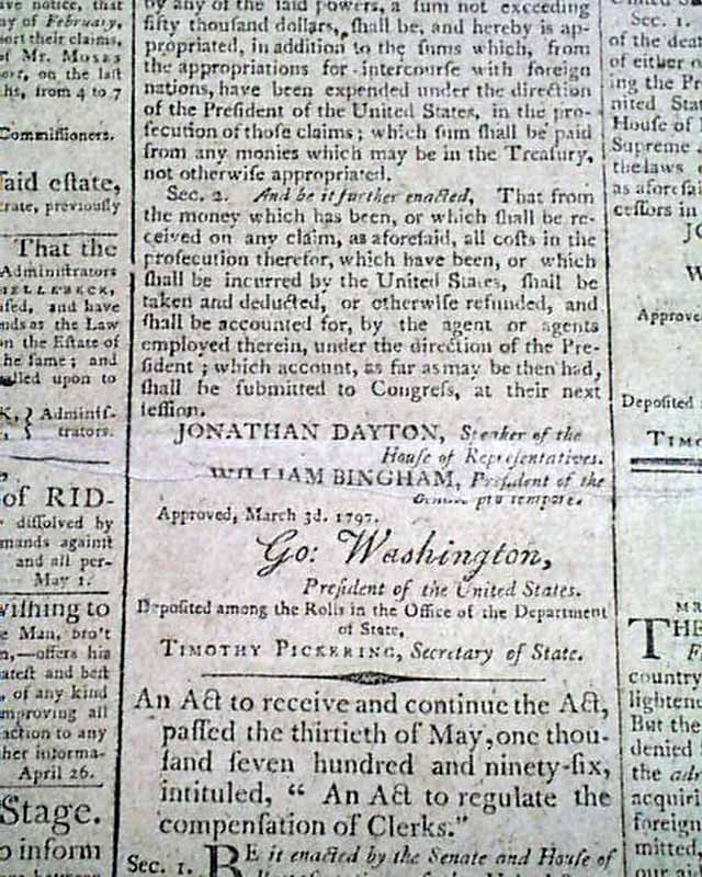 COLUMBIAN CENTINEL, Boston, May 10, 1797  The middle of the front page contains not one but four Acts of Congress, each signed in script type by the President: Go. Washington.