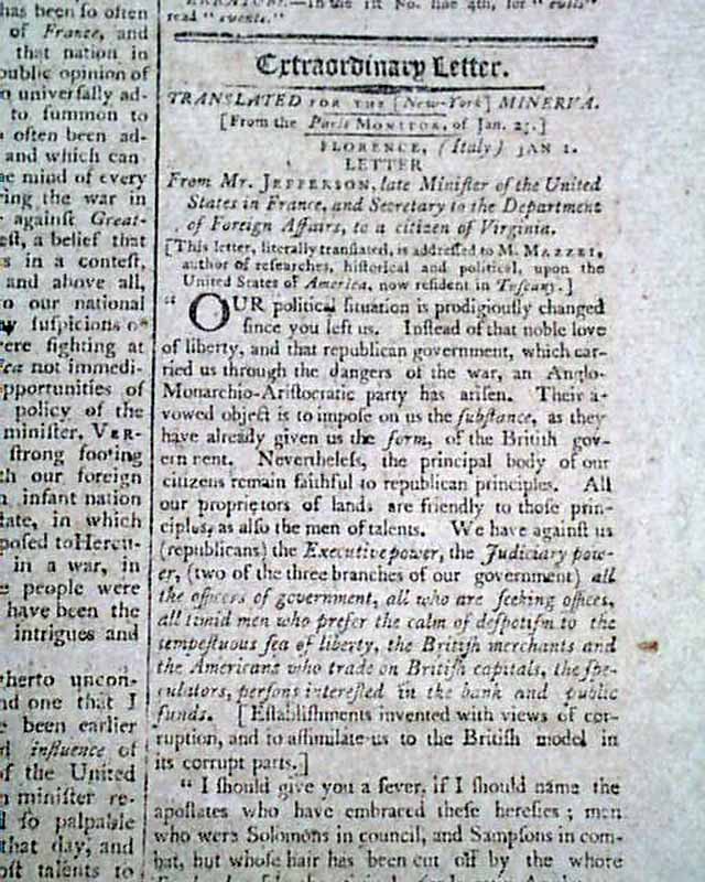 Beginning on the front page & concluding on page 2 is a letter: "From Mr. Jefferson, late Minister of the United States in France...to a citizen of Virginia."