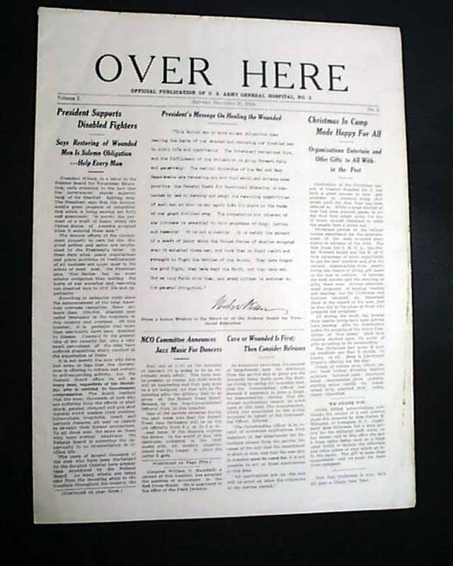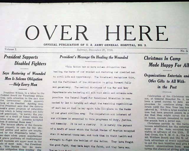 OVER HERE, "Official Publication of U.S. Army General Hospital", Rahway, New Jersey, Dec. 27, 1918 The title is likely a nod to the popular WWI song "Over There" written by George M. Cohan. This is the volume 1, number 5 issue.