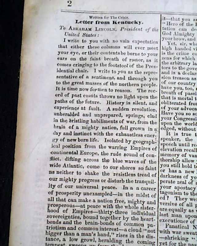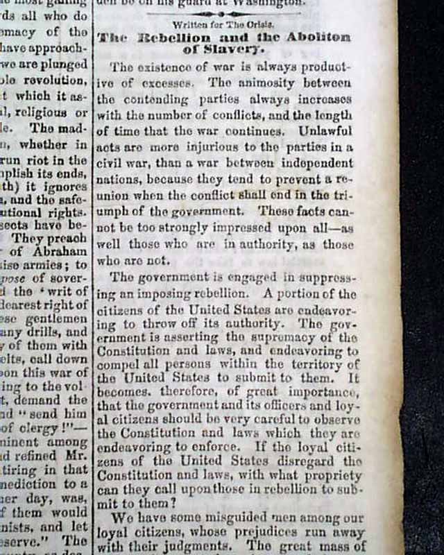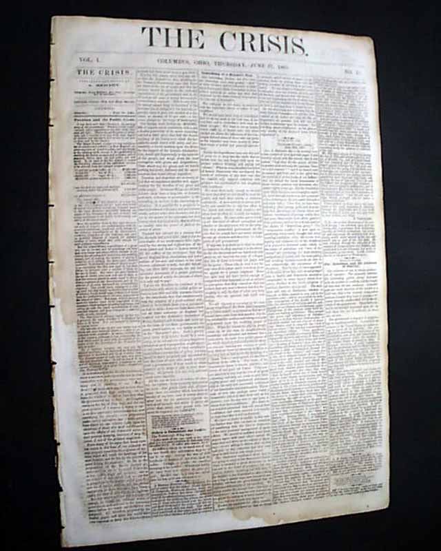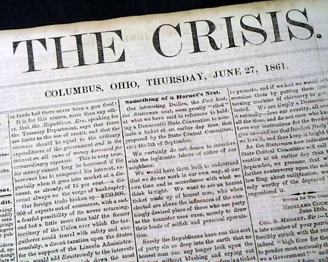 THE CRISIS, Columbus, Ohio, June 27, 1861 This was an anti-war newspaper that insisted slavery should not be abolished, so consequently, much content has an anti-North bias.