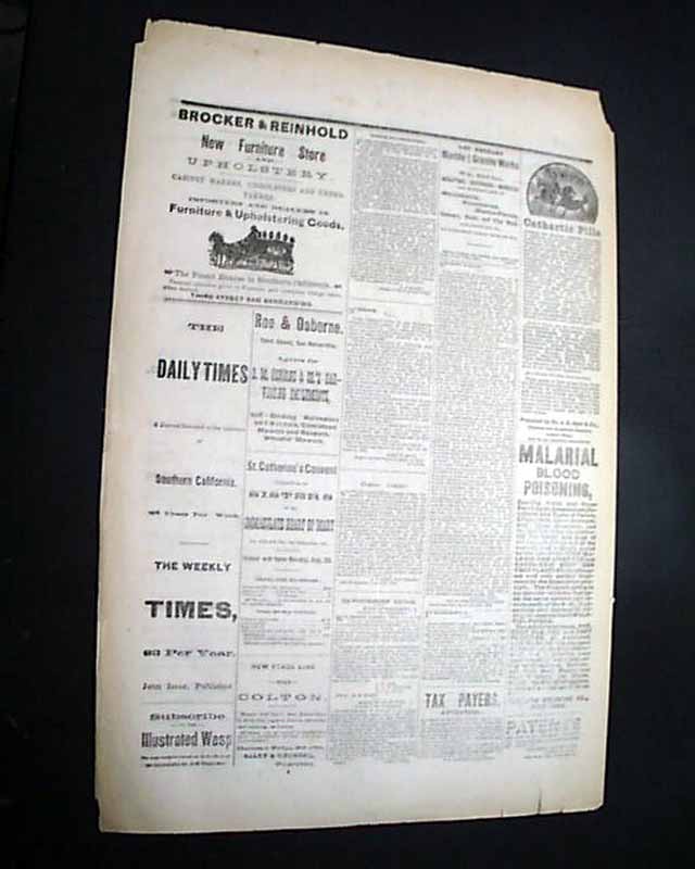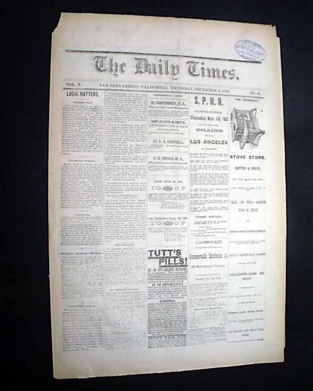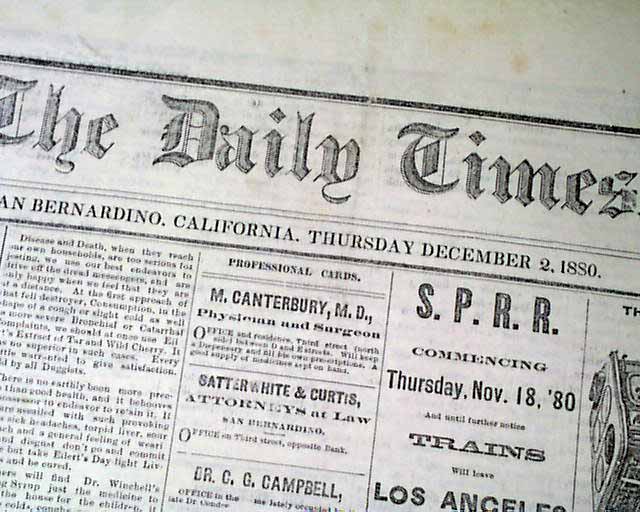THE DAILY TIMES, San Bernardino, California, Dec. 2, 1880 Four pages, never bound nor trimmed, chipping at the upper left corner, slight edge tears along the bottom margin, in the nice condition.