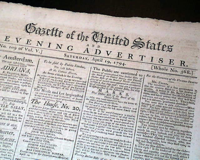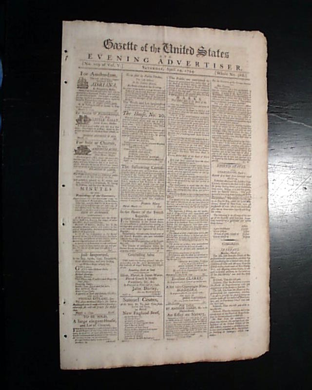 GAZETTE OF THE UNITED STATES & EVENING ADVERTISER, Philadelphia, April 19, 1794