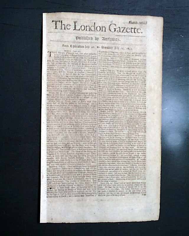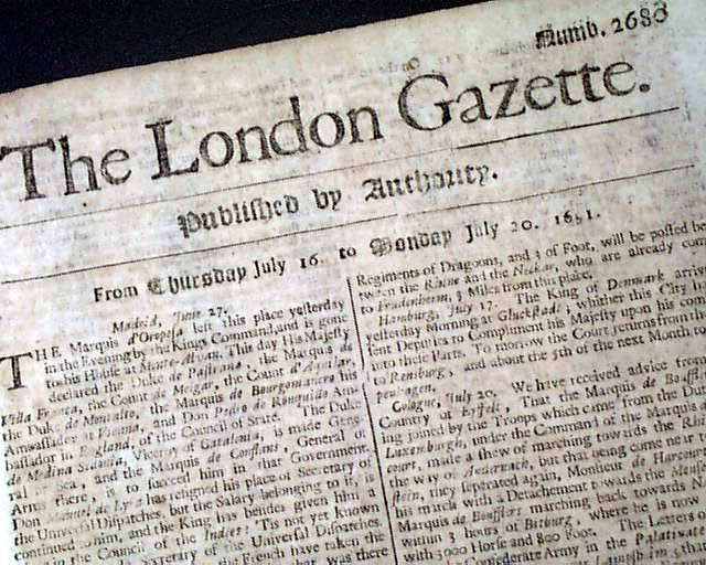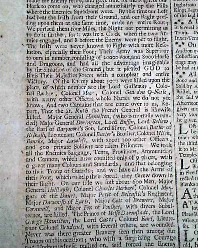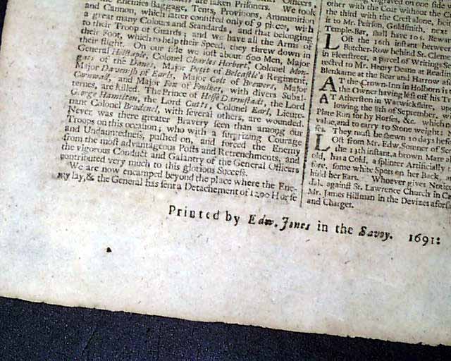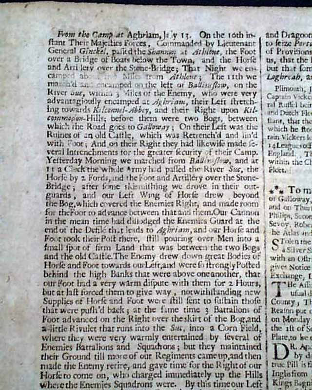 THE LONDON GAZETTE, England, July 20, 1691  Over half of the back page is taken up with a detailed account of the Battle of Aughrim.