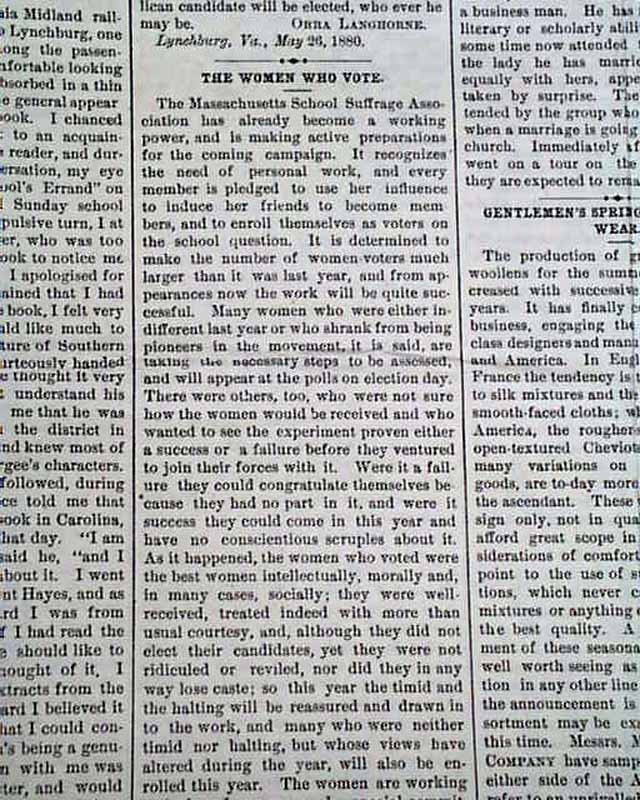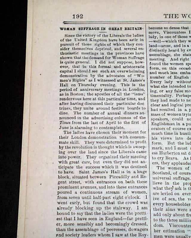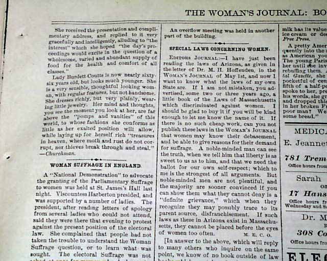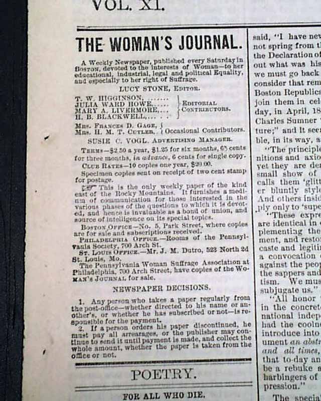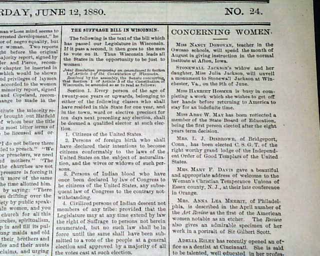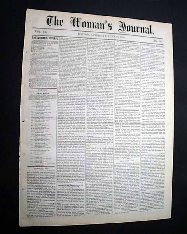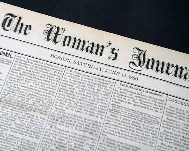 THE WOMAN'S JOURNAL, Boston, June 12, 1880 This women's suffrage paper was founded in 1870, produced by--among others--Lucy Stone, Alice Blackwell, Julia Ward Howe, and Mary Livermore. Published: "...to the interests of Woman, to her educational, industrial, legal & political Equality, & especially to her right of Suffrage" as noted on the front page.