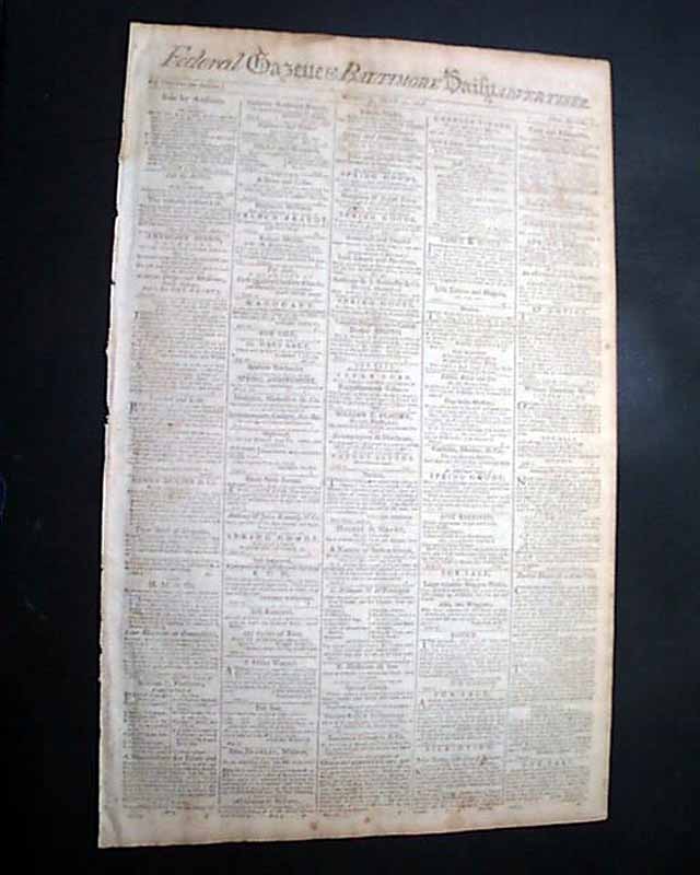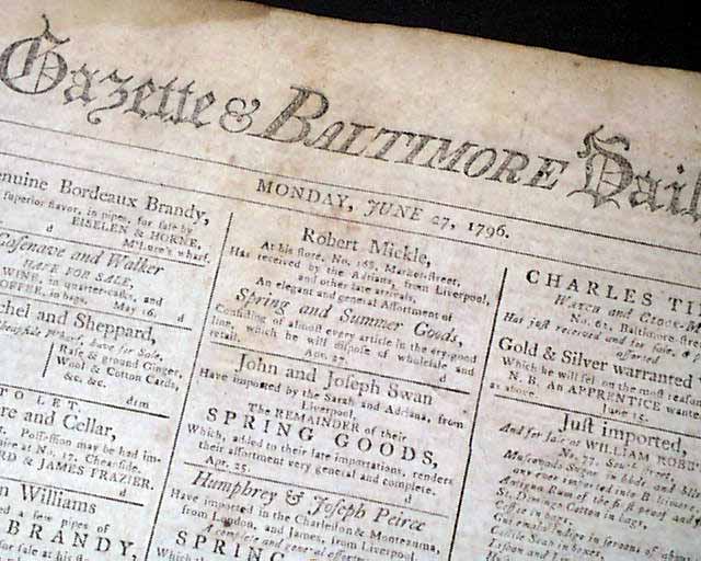 FEDERAL GAZETTE & BALTIMORE DAILY ADVERTISER, June 27, 1796 Curiously, five different type fonts are used to print the title in the masthead.