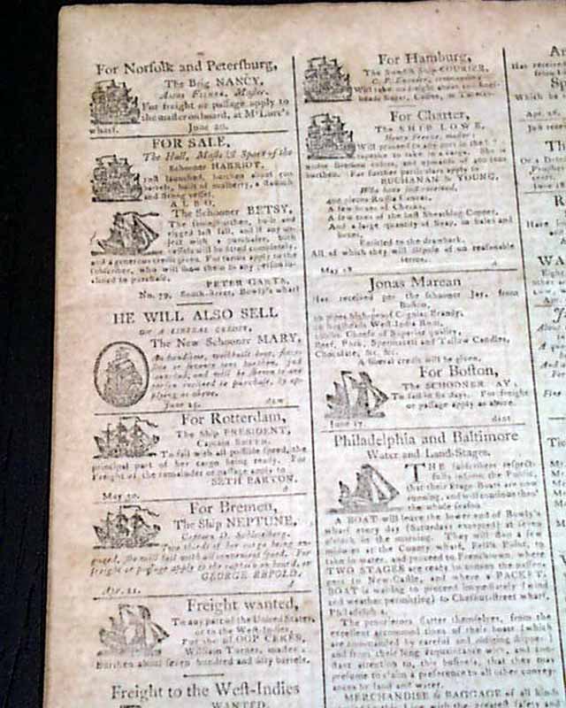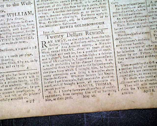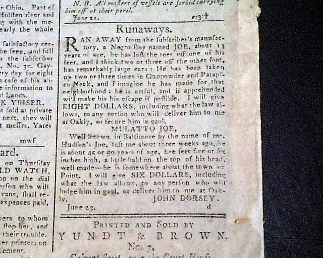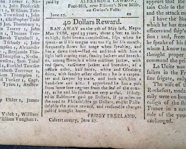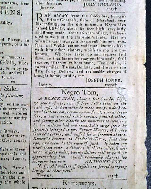 This issue has no fewer than five ads for runaway slaves, each with details. The back page has 18 illustrated ship ads.