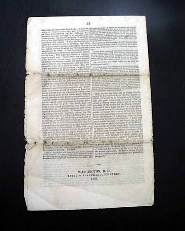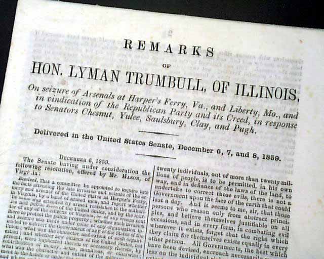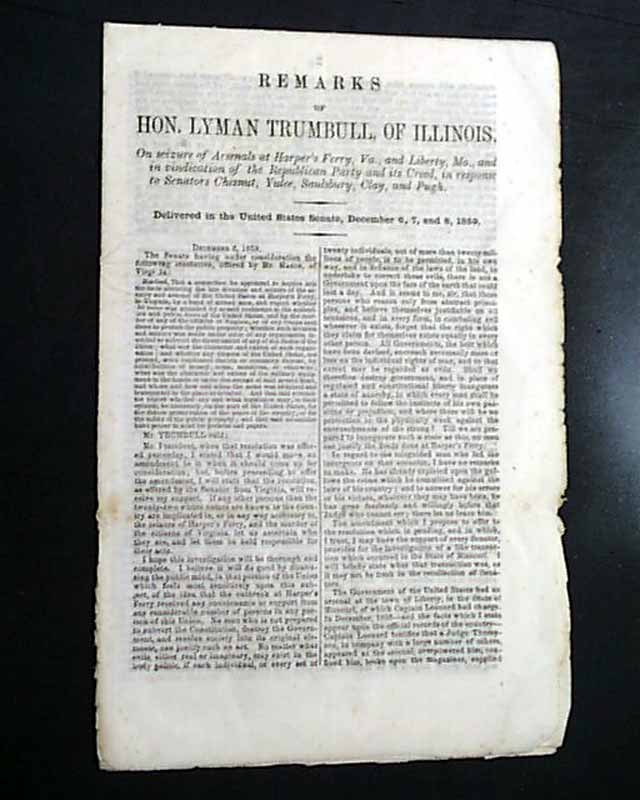 Pamphlet: "REMARKS of HON. LYMAN TRUBULL, OF ILLINOIS, ON seizure of Arsenals at Harper's Ferry, Va., and Liberty, Mo., and in vindication of the Republican Party and its Creed, in response to Senators Chesnut, Yulee, Saulsbury, Clay, and Pugh. Delivered in the United States Senate, December 6, 7 and 8, 1859". Printed at Washington, D.C., Buell & Blanchard, printers, 1859.