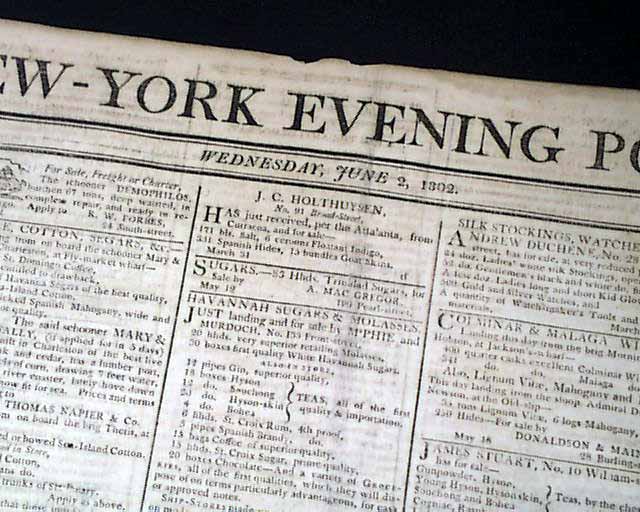 NEW YORK EVENING POST, June 2, 1802  This is the famous newspaper founded by Alexander Hamilton in 1801, still publishing today.