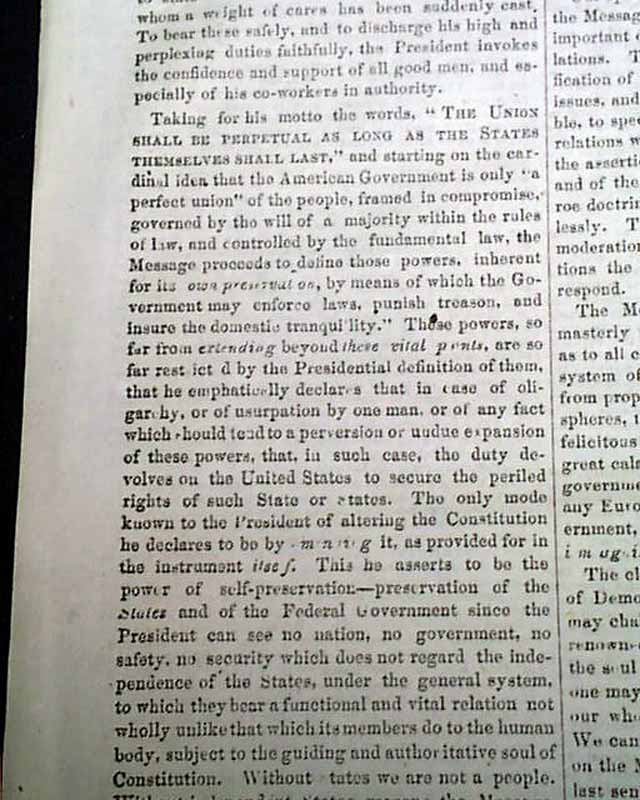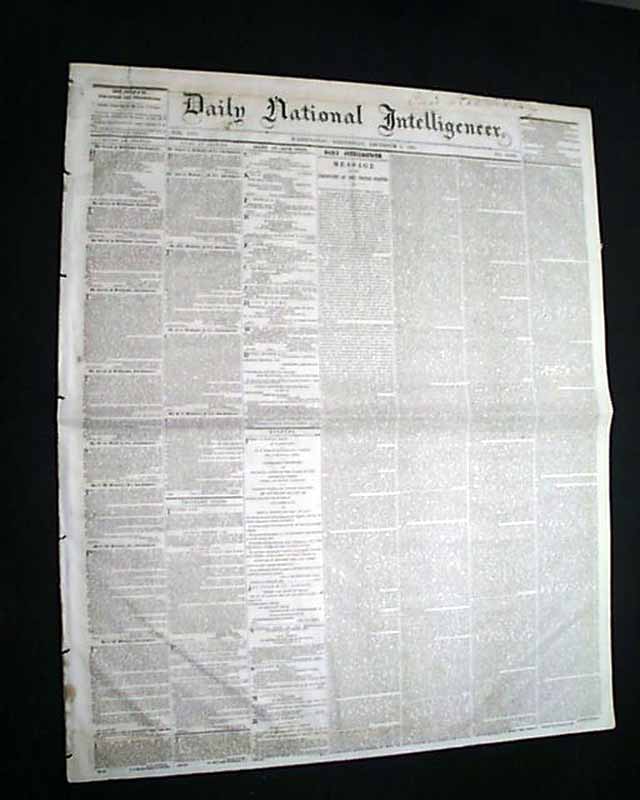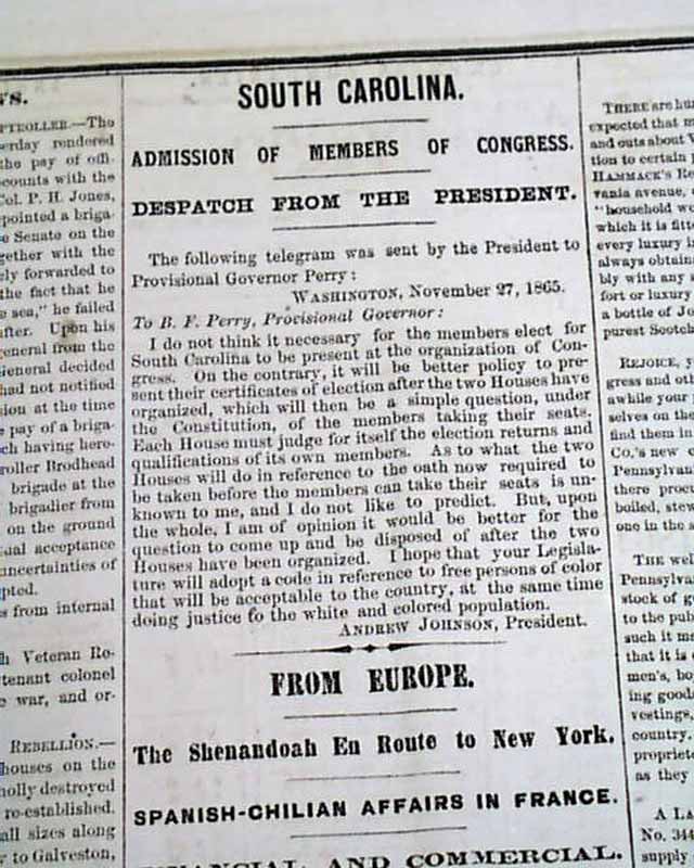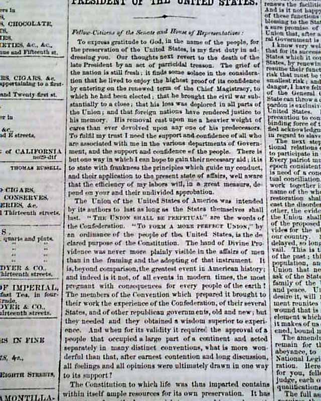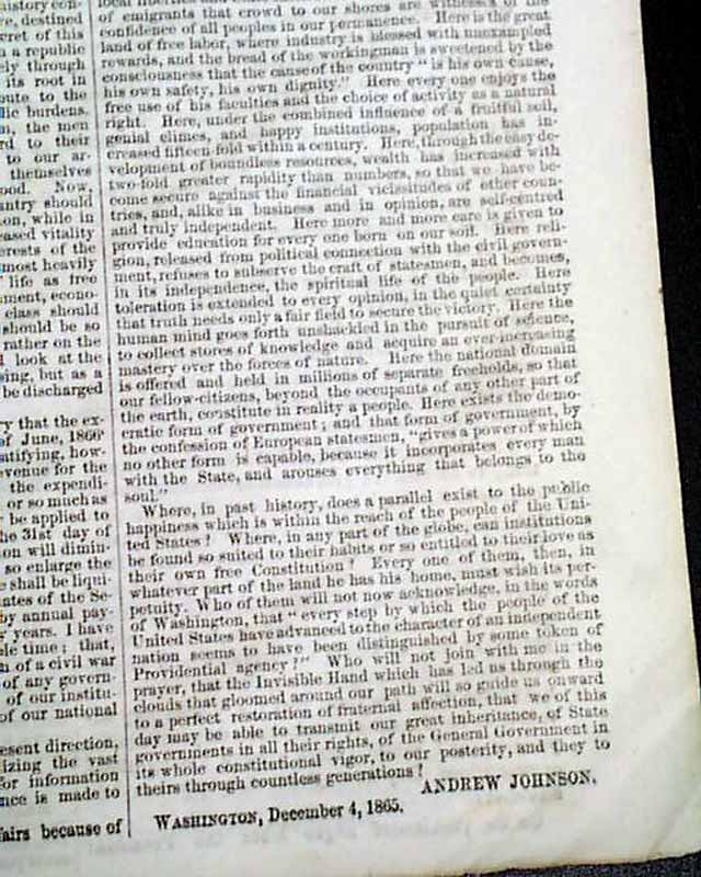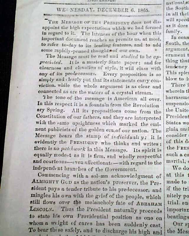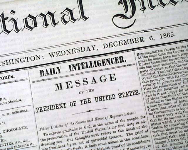 DAILY NATIONAL INTELLIGENCER, Washington, D.C., Dec. 6, 1865 If there is a title reporting any political news that is desired by collectors it would be this one, as the Intelligencer Over half of the front page is taken up with the: "MESSAGE of the PRESIDENT OF THE UNITED STATES" which consumes 4 columns with the complete text, signed in type: Andrew Johnson.
