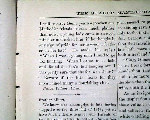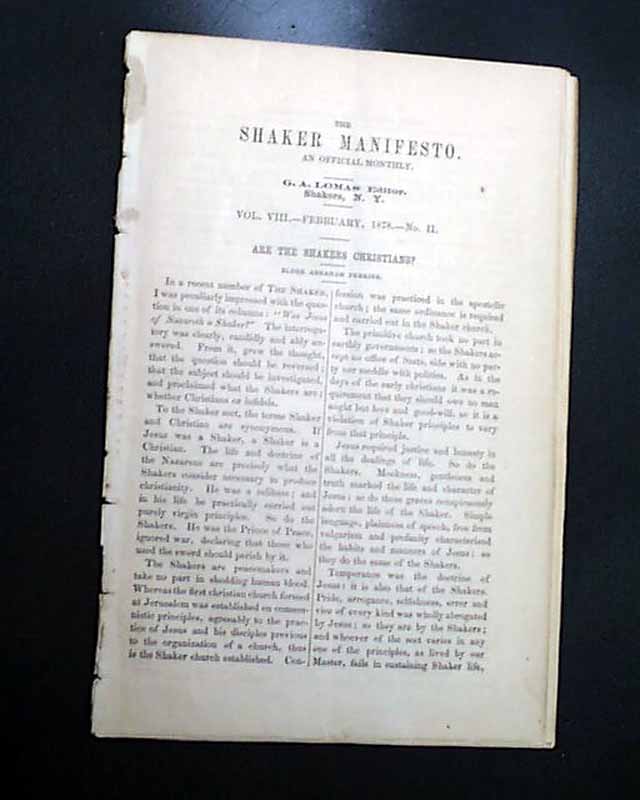 THE SHAKER MANIFESTO, Shakers, New York, February, 1878 This was the "Official Monthly" published by the "United Societies". The Shakers were a religious sect primarily known today for their cultural contributions, principally style of furniture and their model of gender equality.