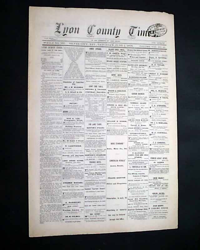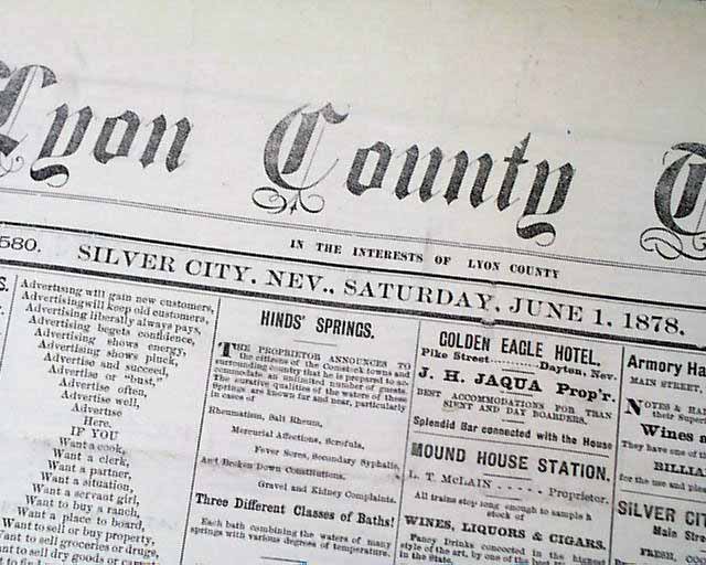 LYON COUNTY TIMES, Silver City, Nevada, June 1, 1878  Wikipedia offers much information on this early mining town: Silver City was established in 1859, named for the silver deposits discovered in the area. Through this narrow gorge thousands of travelers passed on their way to the silver mines of the Comstock Lode.