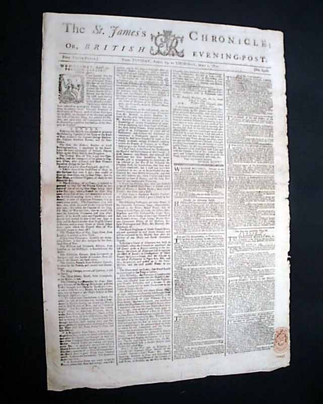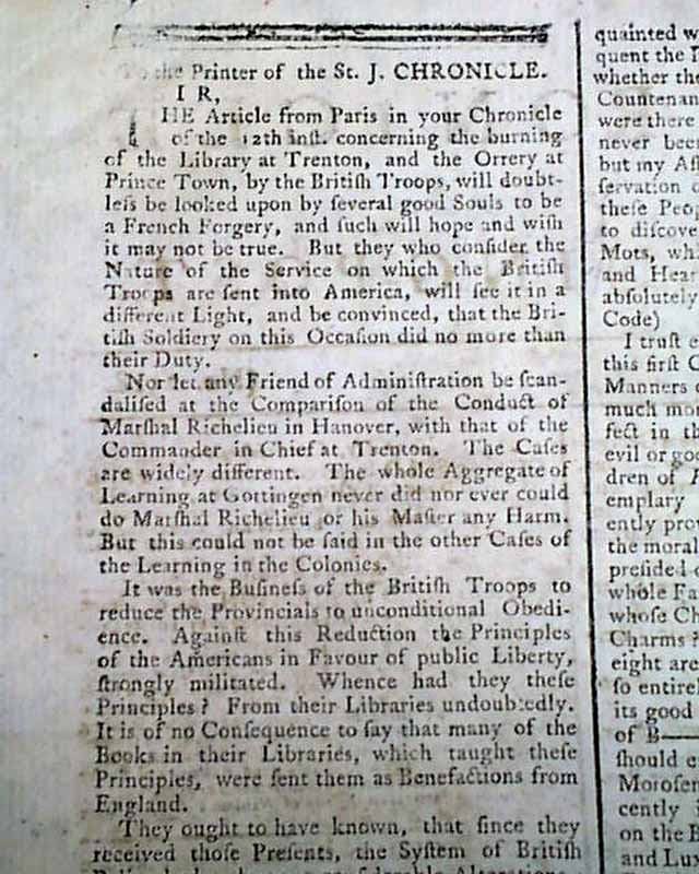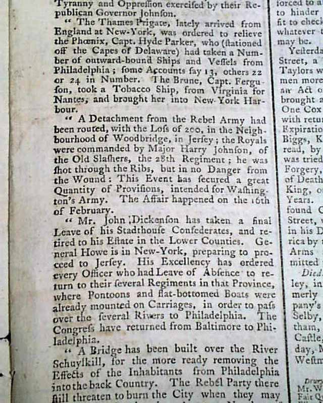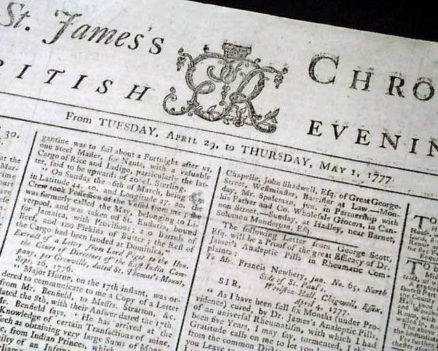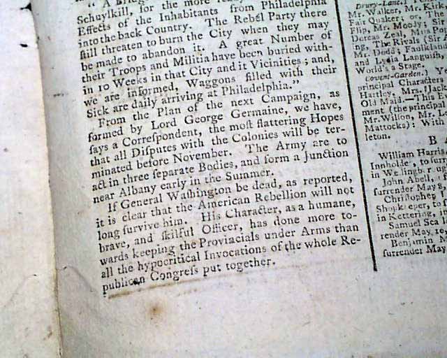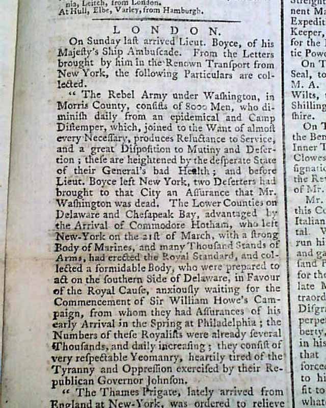 THE ST. JAMES'S CHRONICLE OR BRITISH EVENING-POST, London, England, May 1, 1777  Page 3 has a report that includes: "The Rebel Army under Washington, in Morris County, consists of 8000 men who diminish daily from an epidemical and camp distemper, which, joined to the want of almost every necessary, produces reluctance to service and a great disposition to mutiny & desertion...A detachment from the Rebel Army had been routed with the loss of 200 in the neighbourhood of Woodbridge in Jersey...General Howe is in New York preparing to proceed to Jersey...A bridge has been built over the River Schuylkill...If General Washington be dead, as reported, it is clear that the American rebellion will not long survive him..." and much more. A great article.