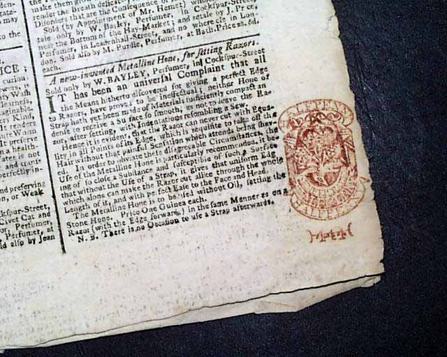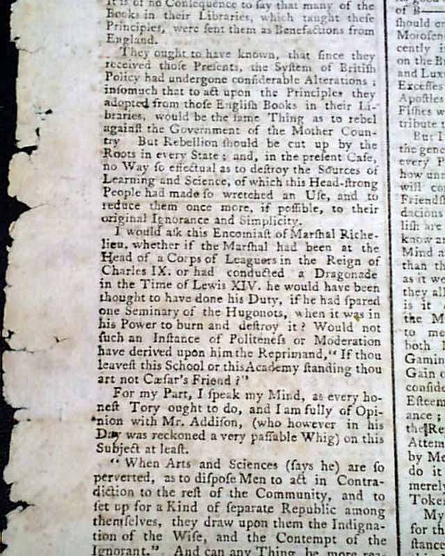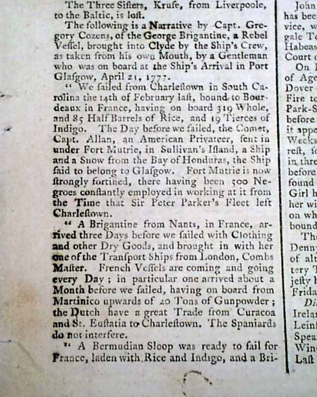 The front page has a report concerning Charleston, and page 2 begins with a letter concerning the war, noting: "...It was the business of our British troops to reduce the Provincials to unconditional obedience..." with more on this.