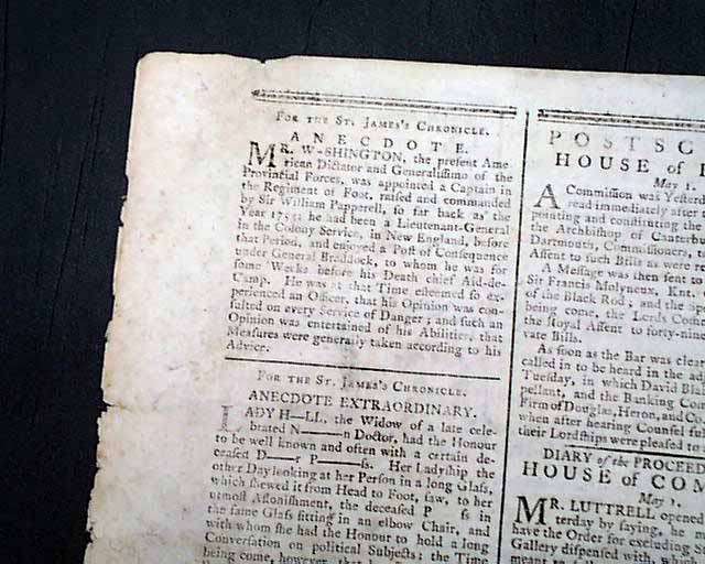 The back page has an: "Anecdote" on George Washington beginning: "Mr. Washington, the present American Dictator and Generalissimo of the Provincial forces..." followed by his military history.