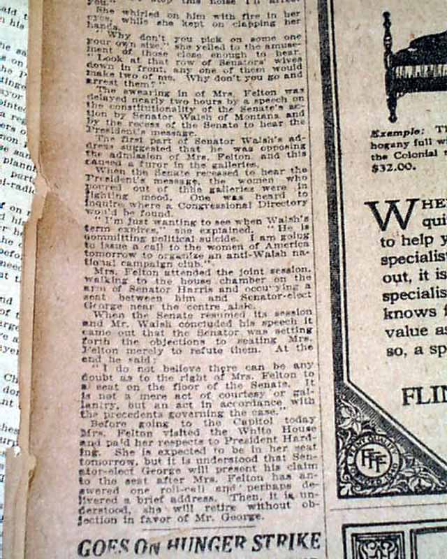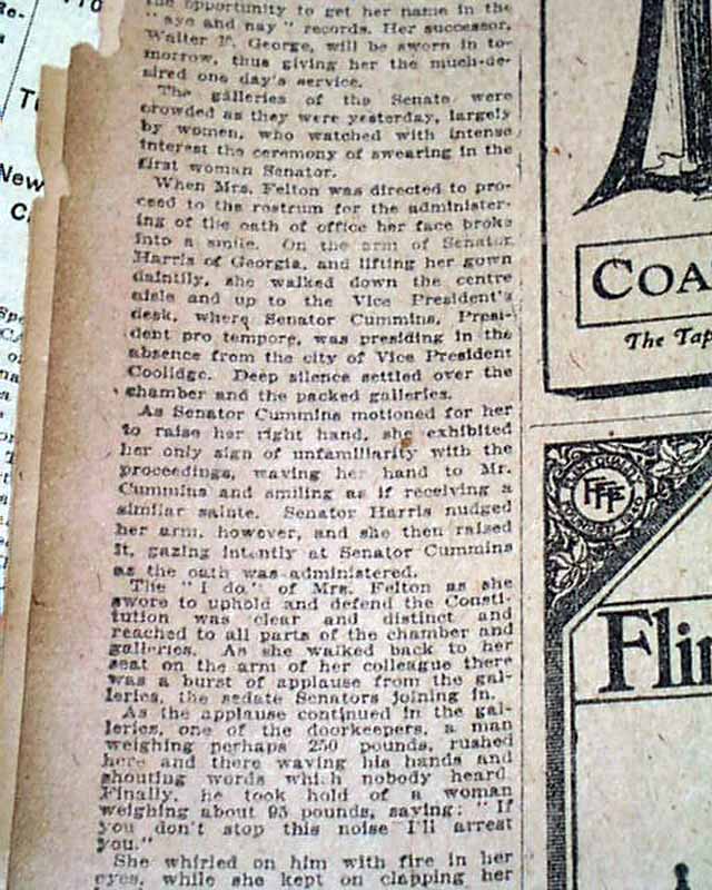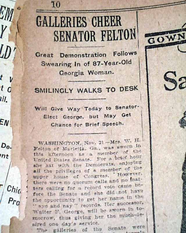 NEW YORK TIMES, Nov. 22, 1922 The first column of page 10 has a report in the first woman taking the oath of office as a Senator - Mrs. W. H. Felton of Georgia. Quite historic.