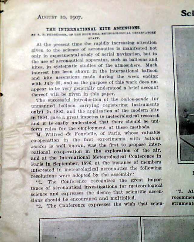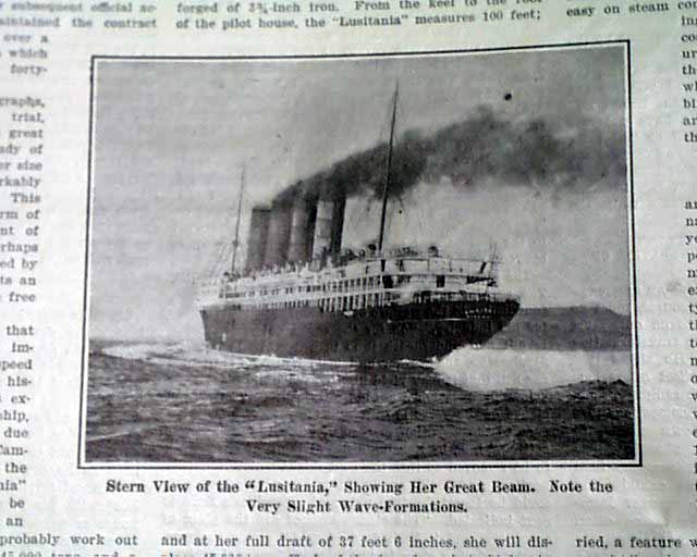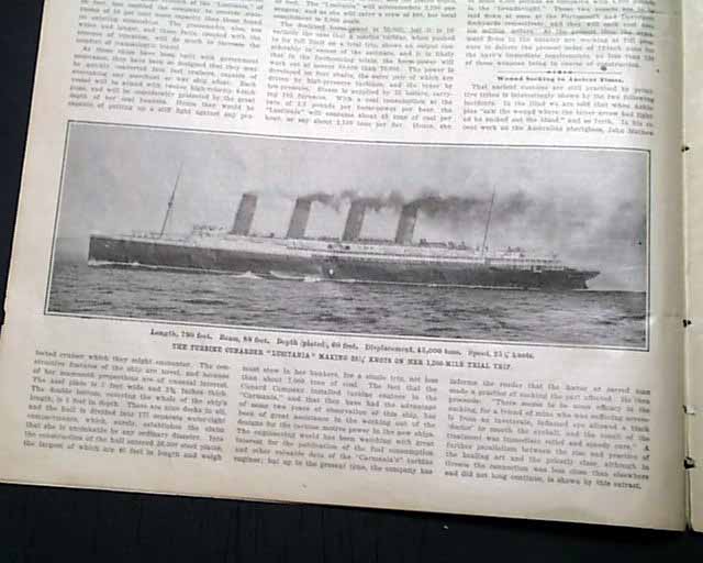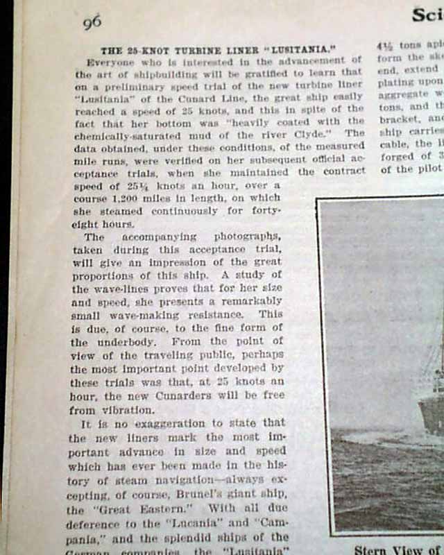 SCIENTIFIC AMERICAN, New York, Aug. 10, 1907 Articles include: "The 25 Knot Turbine Liner 'Lusitania' " which is quite detailed and includes two photos of the ship that would sink 8 years later.
