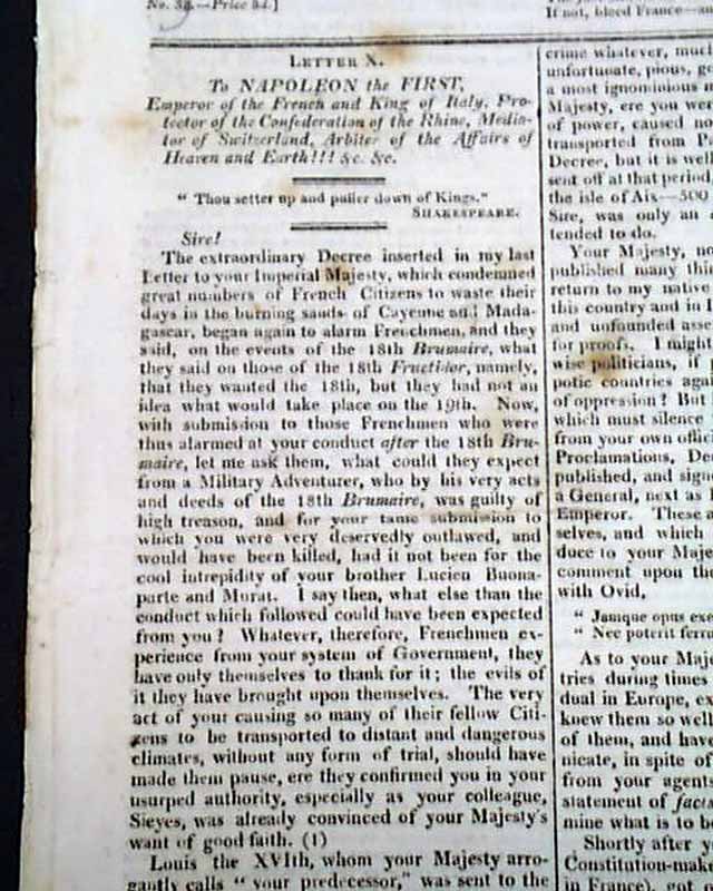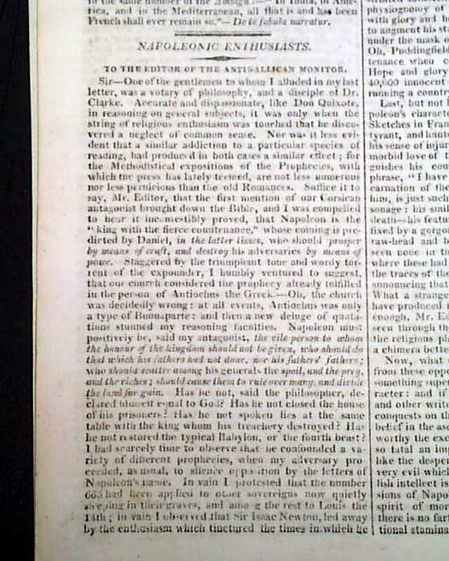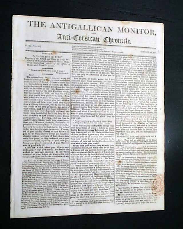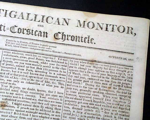 THE ANTIGALLICAN MONITOR & ANTI-CORSICAN CHRONICLE, London, Oct. 20, 1811  Published by Lewis Goldsmith, of Portuguese-Jewish extraction. Previous to publishing this newspaper he spent much time in France acting as a "secret agent" to Napoleon, including efforts to kidnap King Louis XVIII. Goldsmith escaped to England in 1809 & by 1811 he founded this newspaper (subsequently known as the British Monitor, which advocated tyrannicide) through which he denounced the French Revolution.