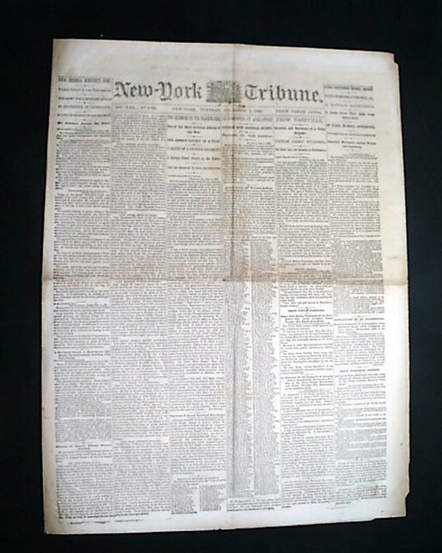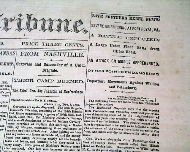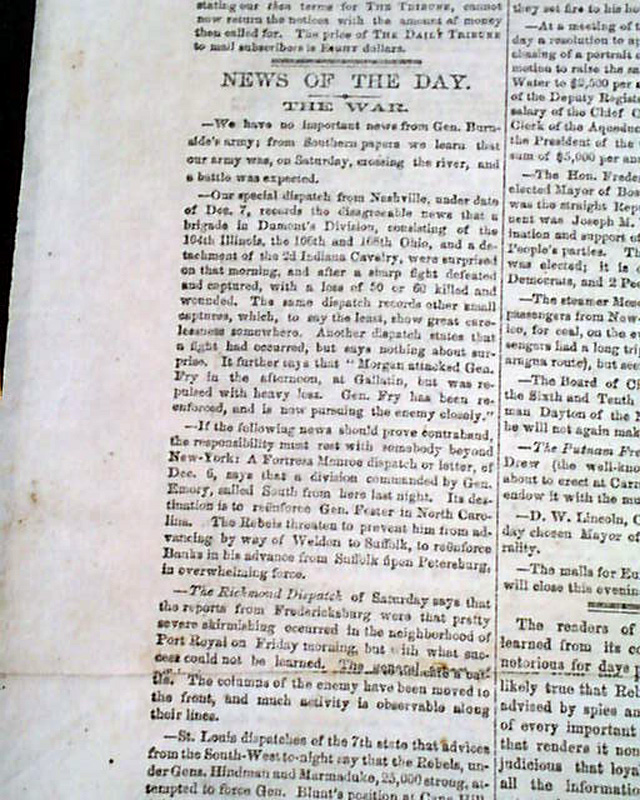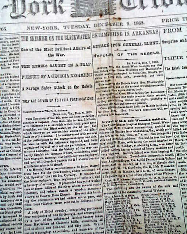 NEW YORK TRIBUNE, Dec. 9, 1862 Among the front page column heads on the Civil War are: "The Skirmish On the Blackwater" "One of the Most Brilliant Affairs of the War" "Rebels Caught in a Trap" "Pursuit of a Georgia Regiment" "Skirmishing In Arkansas" "Attack Upon General Blunt" "From Nashville" "Surprise & Surrender of a Union Brigade" "Severe Skirmishing at Port Royal, Va." "An Attack on Mobile Apprehended" and much more.