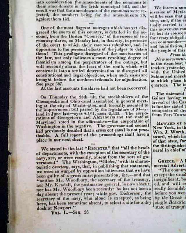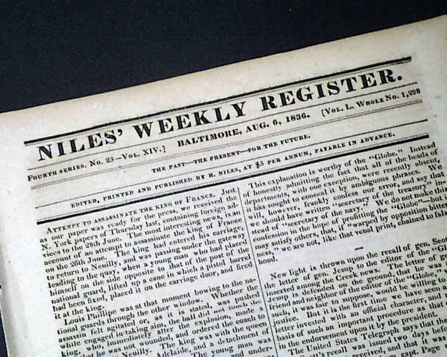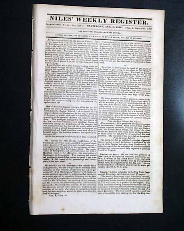NILES' WEEKLY REGISTER, Baltimore, Aug. 6, 1836 The front page has a short report concerning the "outrages" due to the rescue of two runaway slaves.