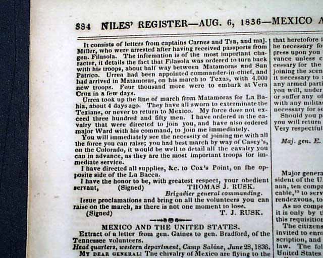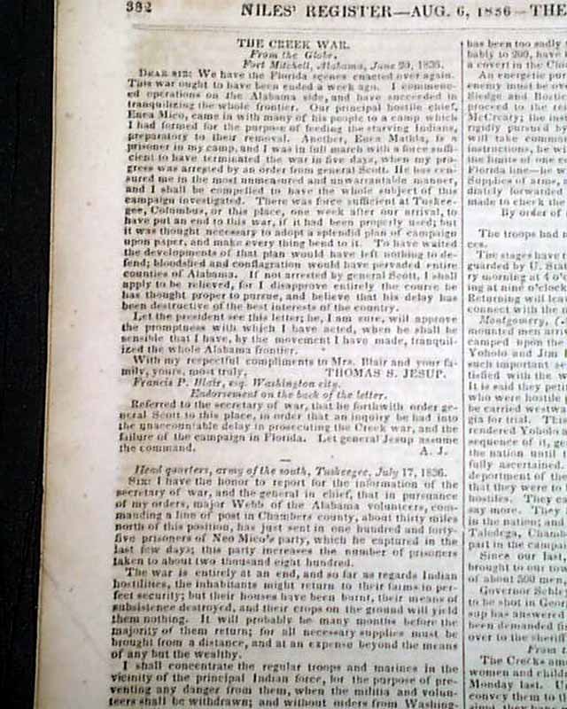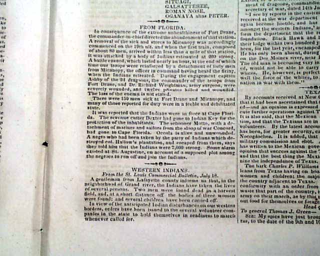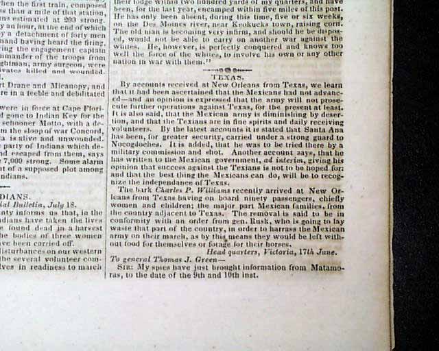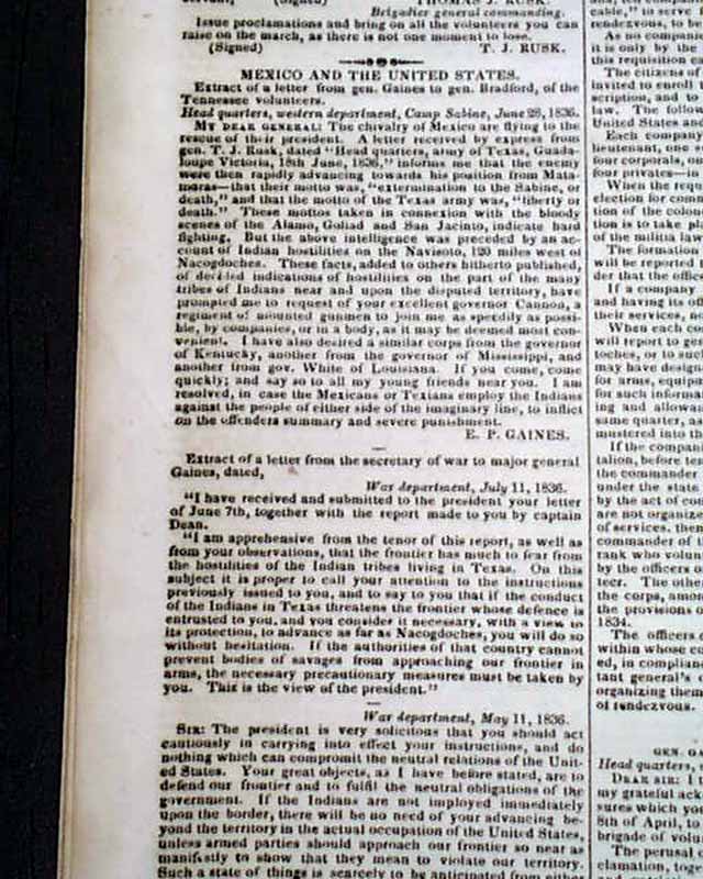 Other articles inside include: "Lynching Among the Indians" "The Creek War" with reports from Fort Mitchell, Alabama; "The Cherokees" "From Florida" "Mexico & the United States" "Western Indians" and "Texas", the latter mentioning that the Mexicans had not advanced and will not prosecute further operations against Texas, for the present, and with mention of Goliad, the Alamo, and San Jacinto.