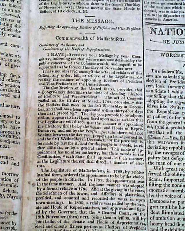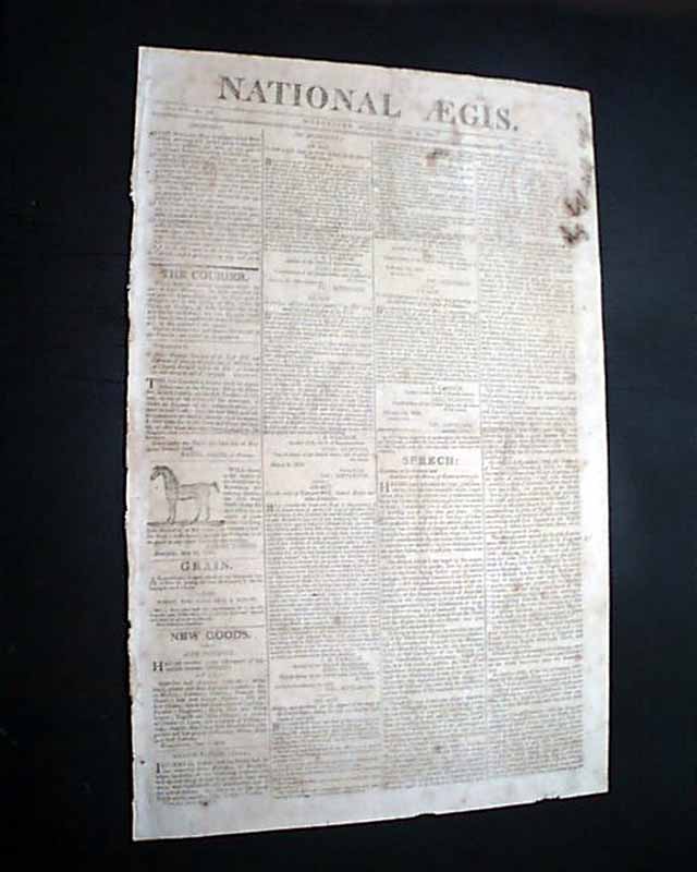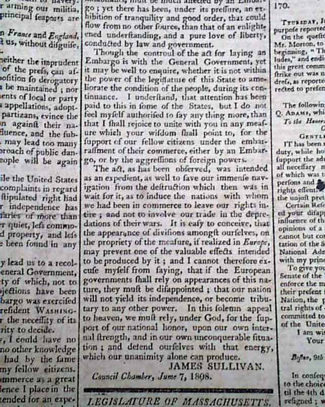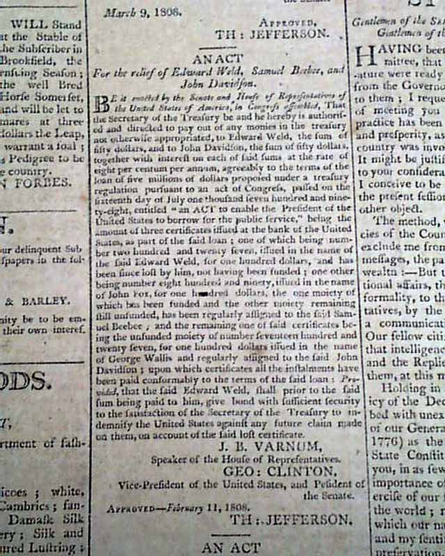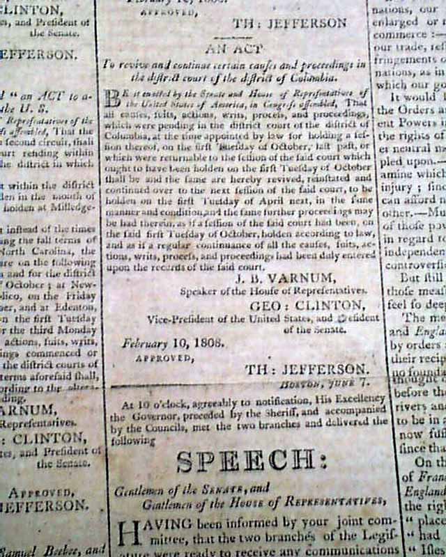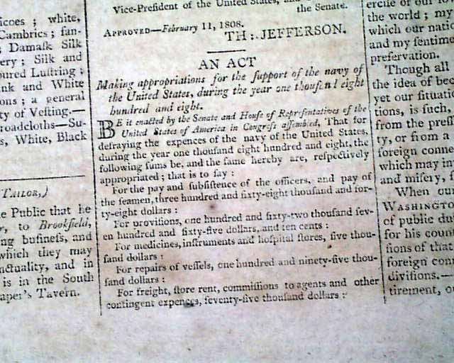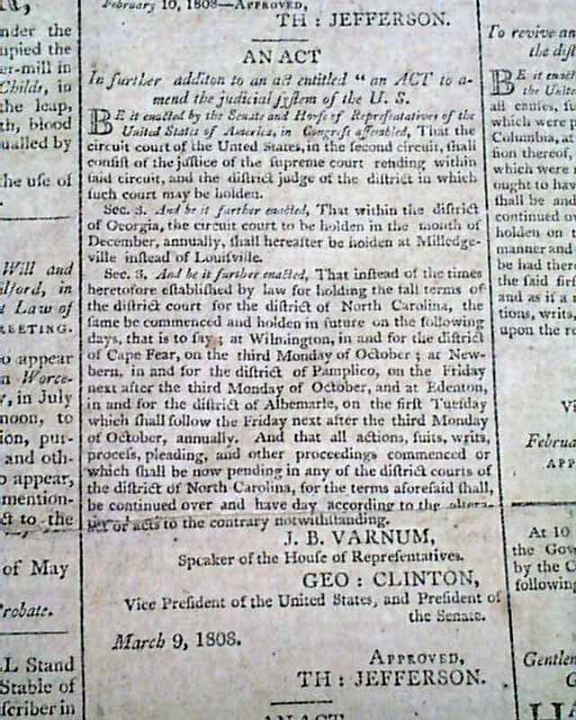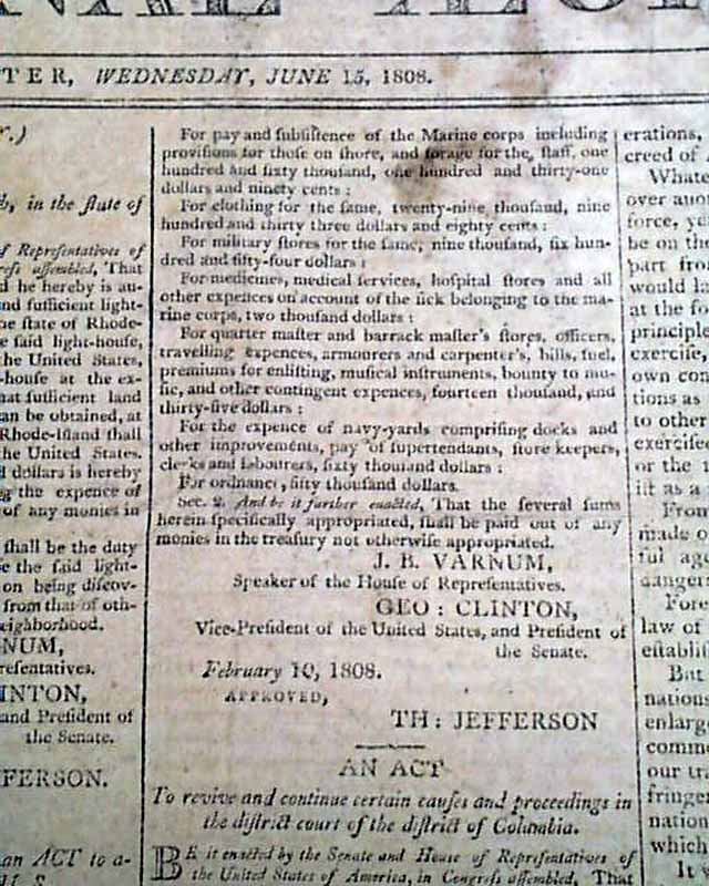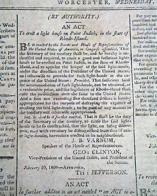 NATIONAL AEGIS, Worcester, Massachusetts, June 15, 1808 The front page contains five Acts of Congress, one to erect a lighthouse on Point Judith in Rhode Island, and another for making appropriations for the support of the Navy of the United States.