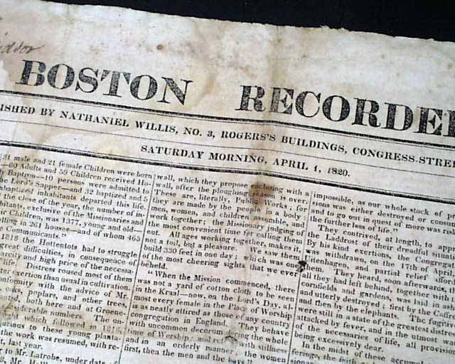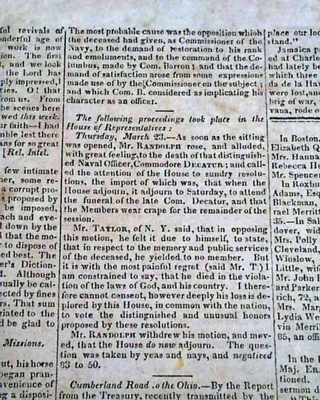 BOSTON RECORDER, April 1, 1820 Page 3 has a report: "Murder of Commodore Decatur" which is a nice account of his fateful duel with Commodore James Barron.