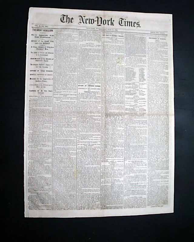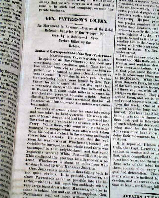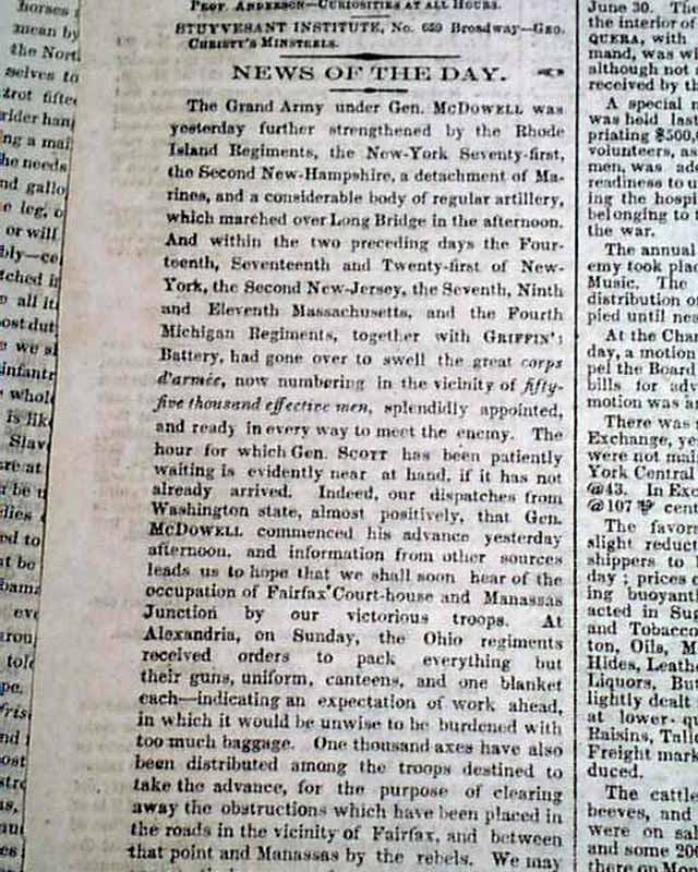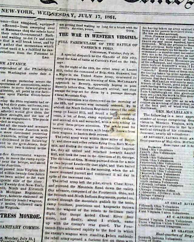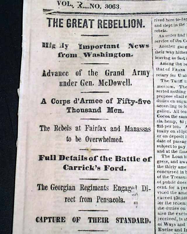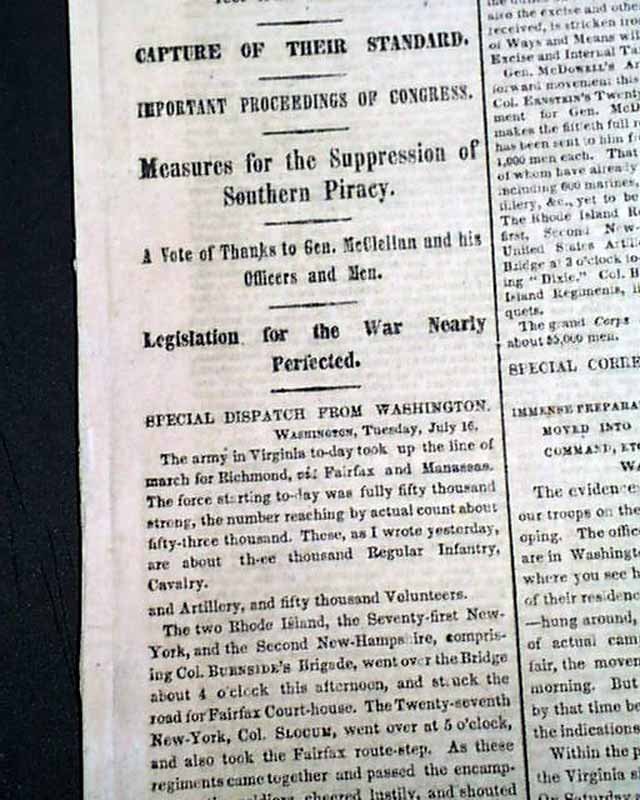 THE NEW YORK TIMES, July 17, 1861  The front page has great coverage on the days just before the historic Battle of Bull Run, with first column heads: "THE GREAT REBELLION" Advance of the Grand Army under Gen. McDowell" "The Rebels at Fairfax & Manassas to be Overwhelmed" "Full Details of the Battle of Cartrick's Ford" "Measures for the Suppression of Southern Piracy" and more. War coverage continues inside as well.