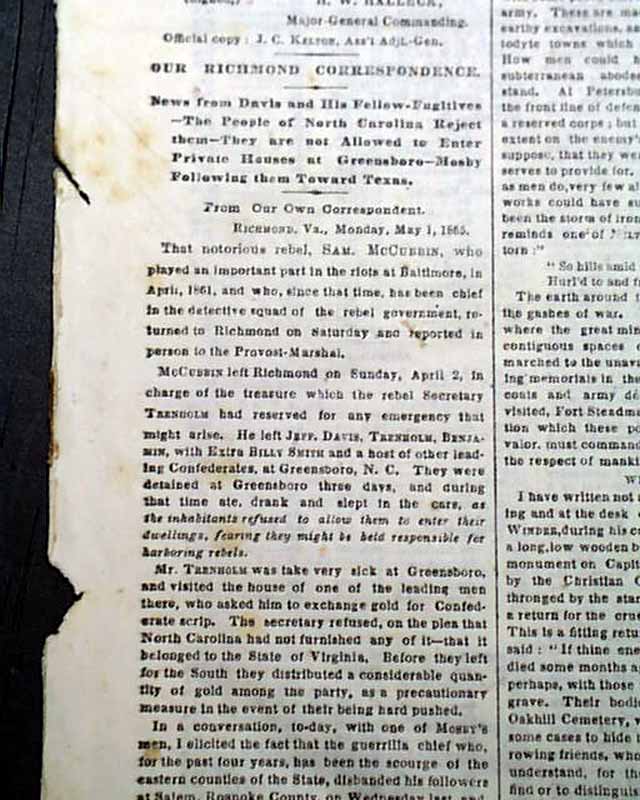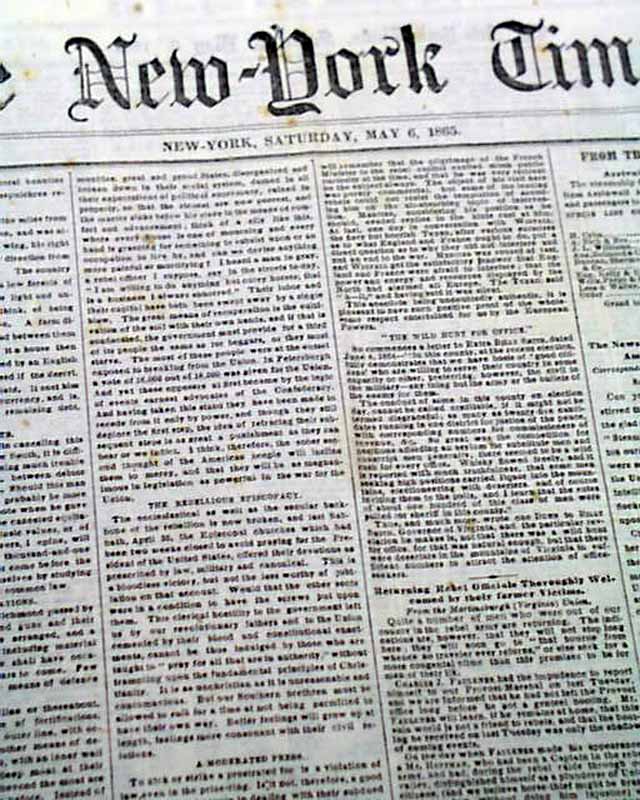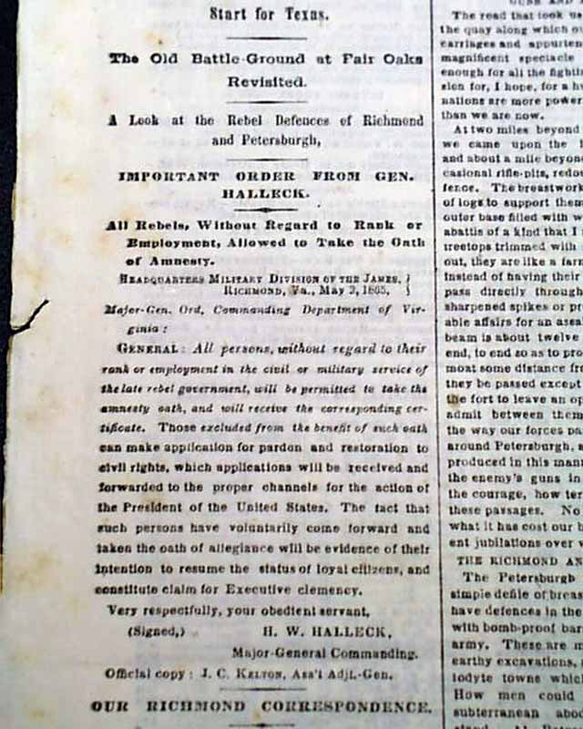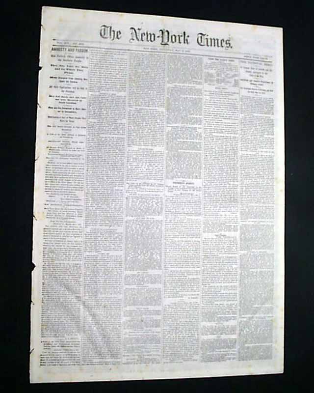 NEW YORK TIMES, May 6, 1865 Among the first column heads on the closing moments of the Civil War are: "AMNESTY & PARDON" "Gen. Halleck Offers Amnesty to the Southern People" "They May Take the Oath and Go Where they Please" "Officers Excepted from Amnesty May Apply for Pardon" "How Jeff Davis & His Cabinet were Received in North Carolina" and more.