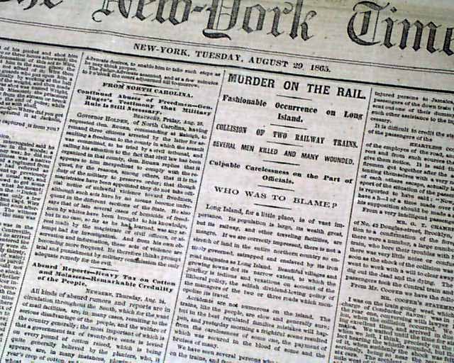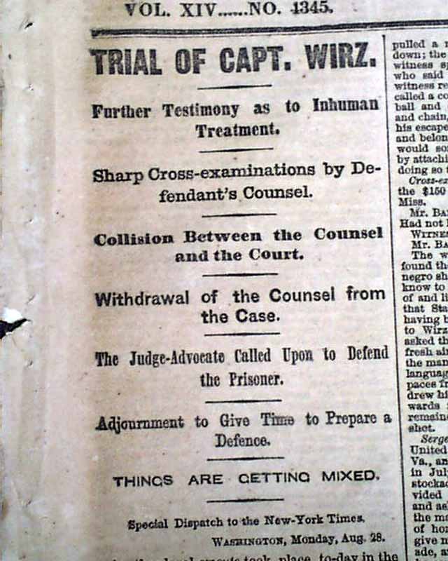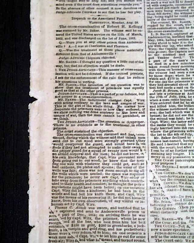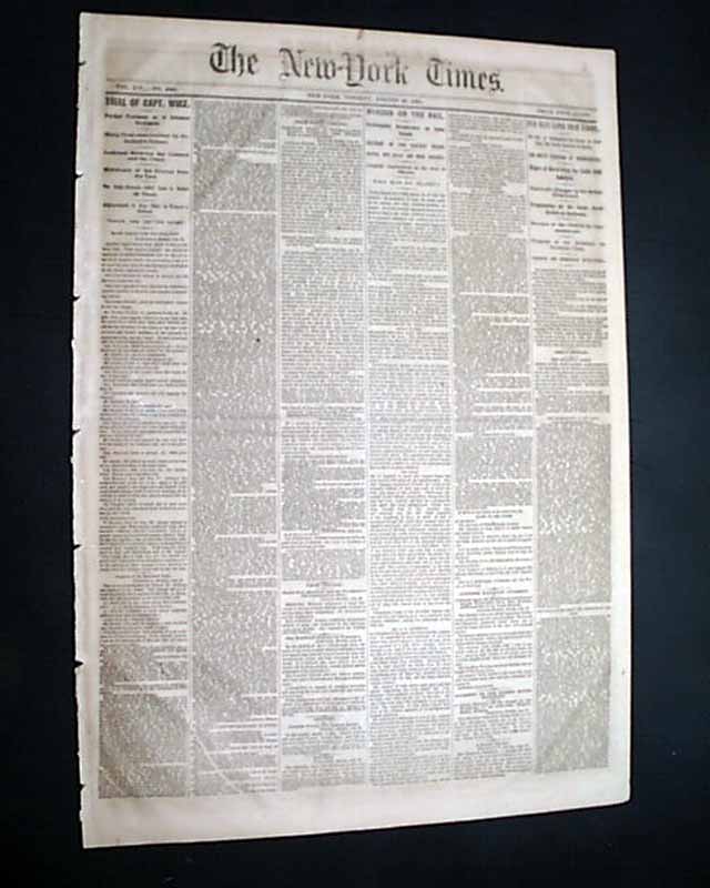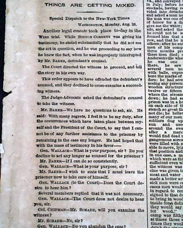 NEW YORK TIMES, Aug. 29, 1865 The front page has much on the trial of Henry Wirz.