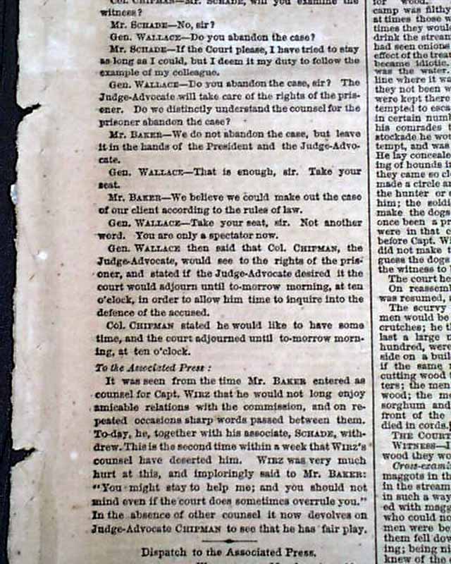 Column heads include: "TRIAL OF CAPT. WIRZ" "Further Testimony as to Inhuman Treatment" "Sharp Cross-examinations by Defendant's Counsel" "Collision Between the Counsel & the Court" and more. This text takes one-third of the front page.