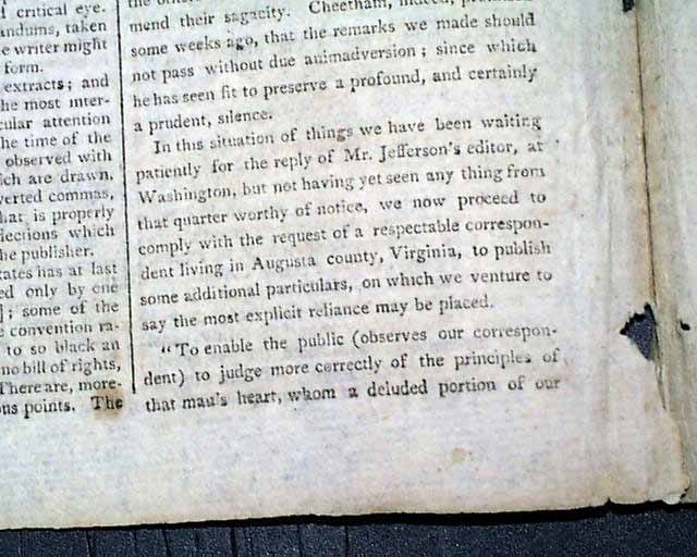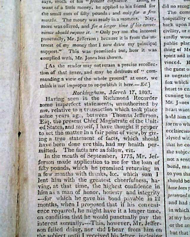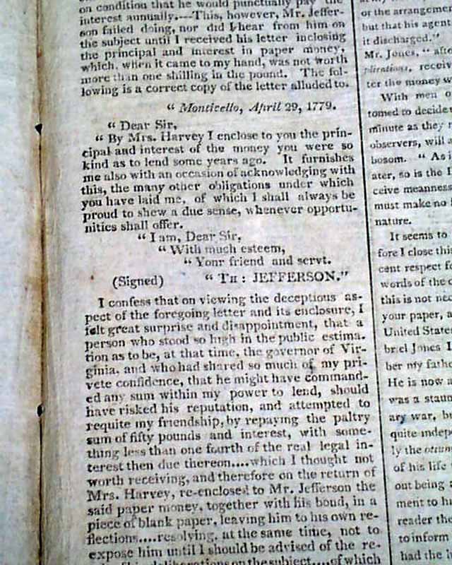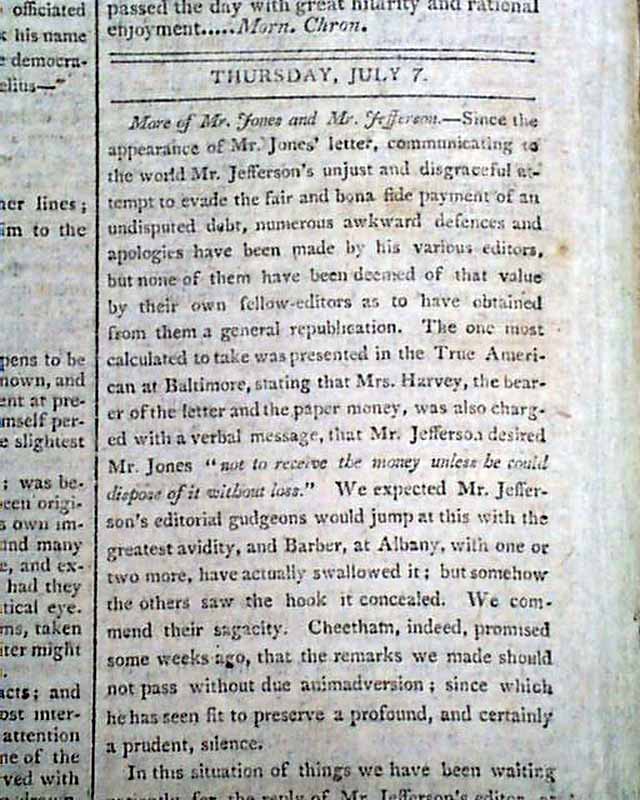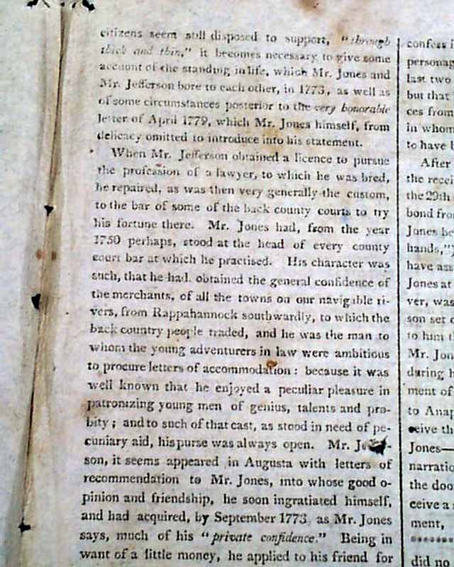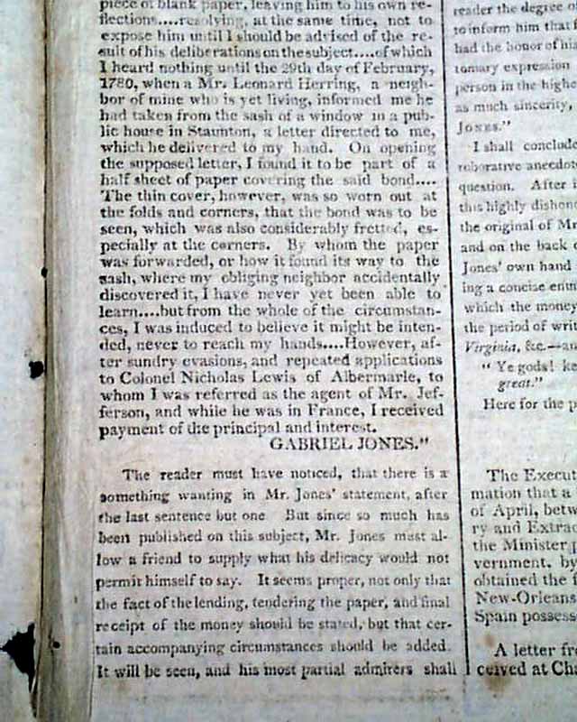 It is prefaced with a report: "More of Mr. Jones and Mr. Jefferson" beginning: "Since the appearance of Mr. Jones' letter, communicating to the world Mr. Jefferson's unjust & disgraceful attempt to evade the fair and bona fide payment of an undisputed debt, numerous awkward defenses & apologies have been made..." with much more.