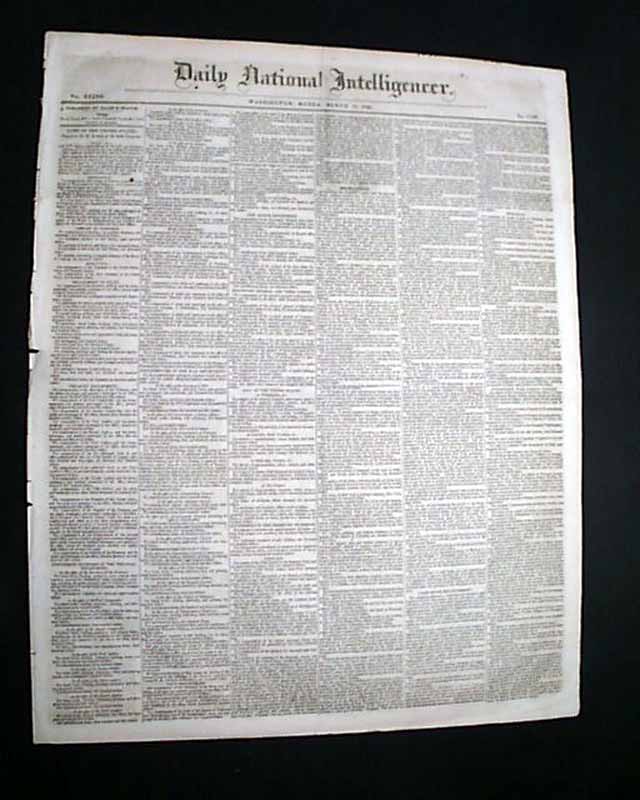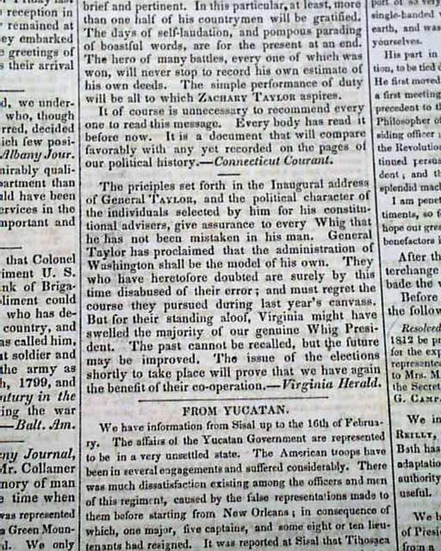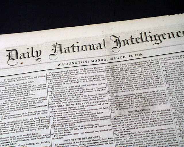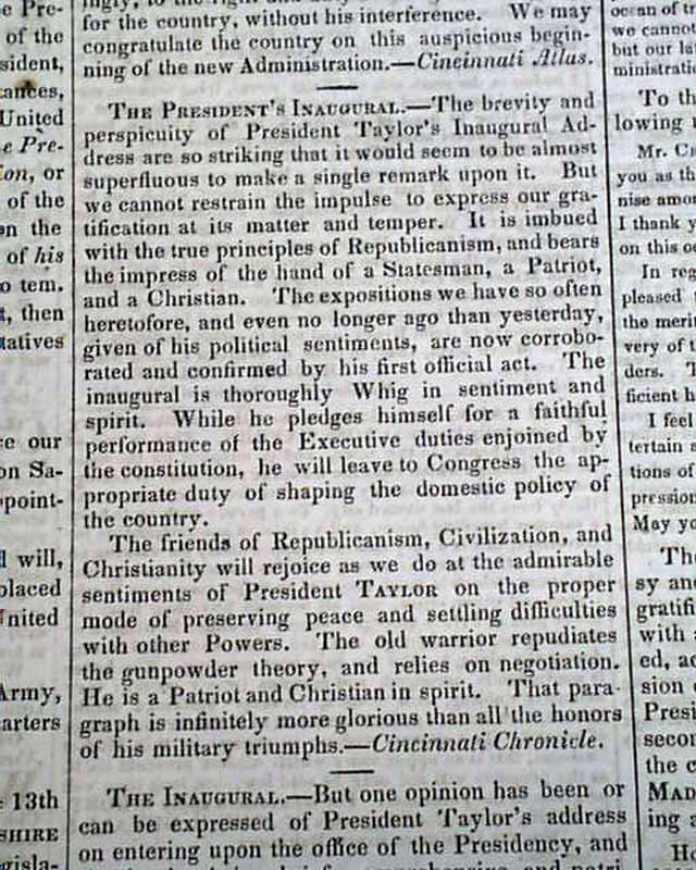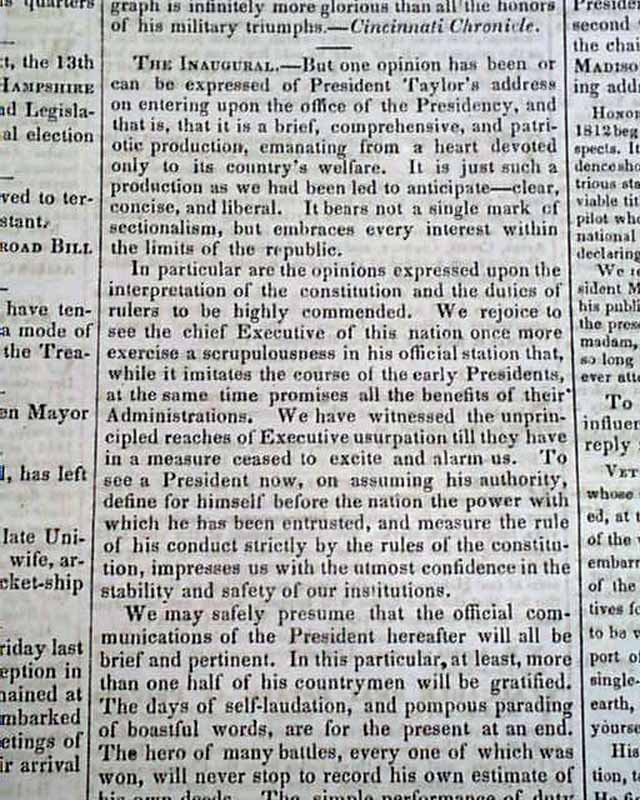 DAILY NATIONAL INTELLIGENCER, Washington, D.C., March 12, 1849 Page 3 has reports headed: "The President's Inaugural which begins: "The brevity and perspicuity of President Taylor's Inaugural Address are so striking that it would seem to be almost superfluous to make a single remark upon it...".