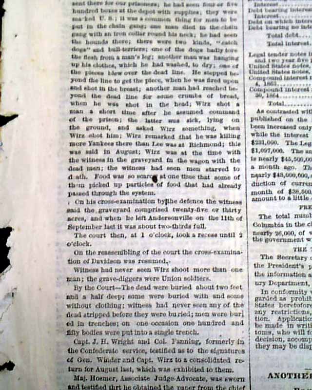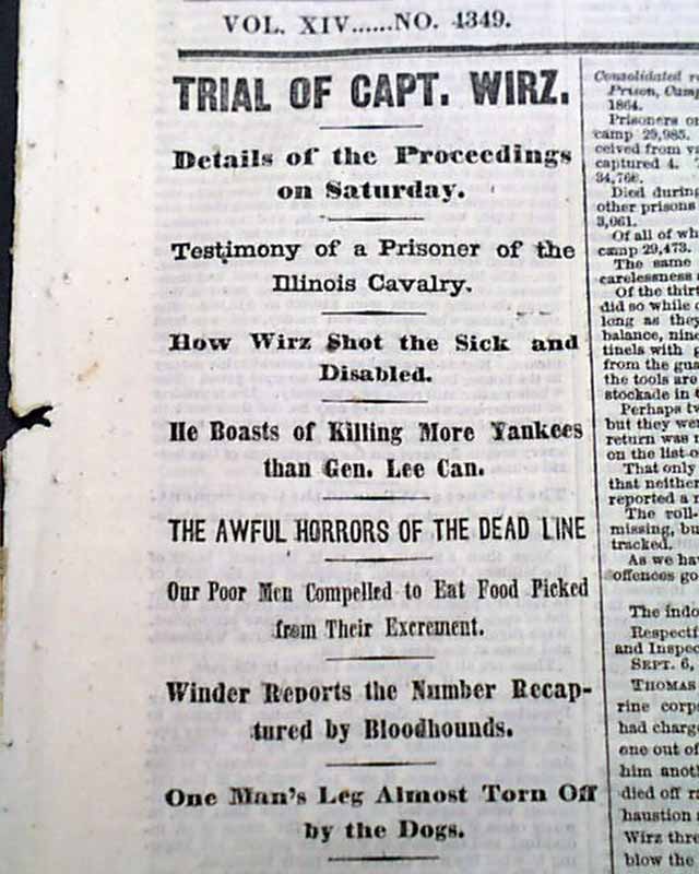 First column heads include: "TRIAL OF CAPT. WIRZ" "Details of the Proceedings on Saturday" "Testimony of a Prisoner of the Illinois Cavalry" "How Wirz Shot the Sick and Disabled" "He Boats of Killing More Yankees than Gen. Lee Can" "The Awful Horrors of the Dead Line" "One Man's Leg Almost Torn Off by the Dogs" and more.