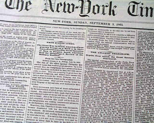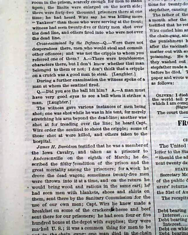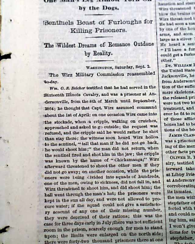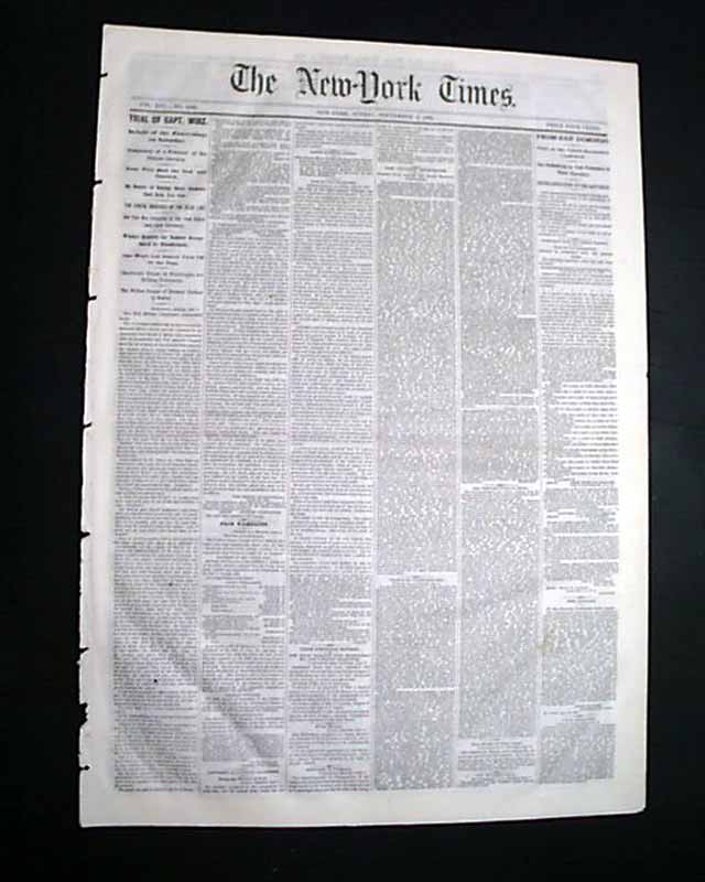 NEW YORK TIMES, Sept. 3, 1865 The front page has reports concerning the trial of Henry Wirz, the warden of the infamous Andersonville, Georgia, prison camp from during the Civil War.